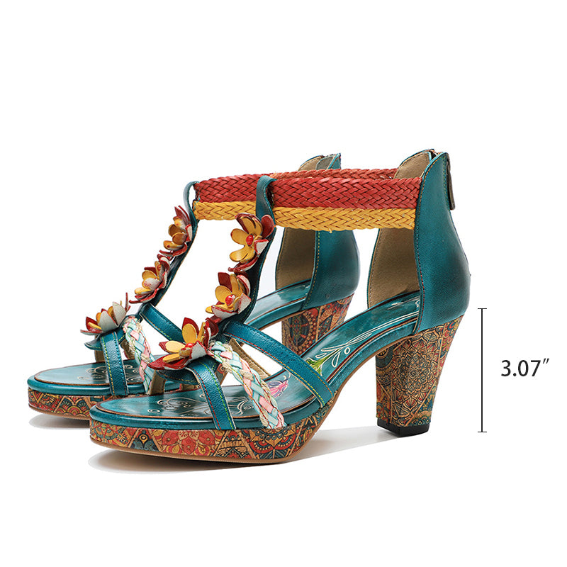 절묘한 프린팅과 꽃, 화려한 반짝이는 블록 힐 디자인, 보헤미안 스타일, 78mm 블록 힐, 레이저 조각, 수동 채색, 정밀 재봉 마킹 라인, 로맨틱 컬러, 독특한 아름다움을 입으십시오.