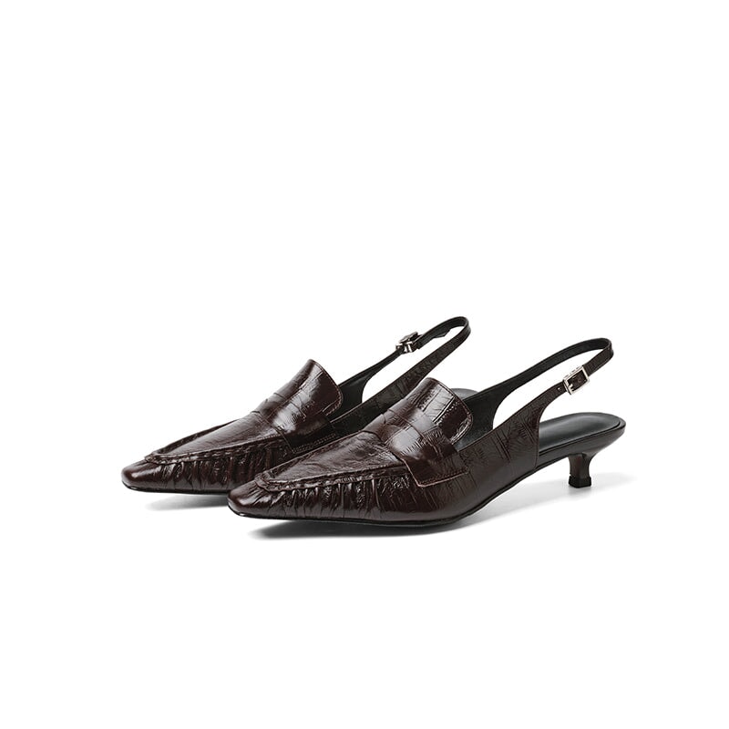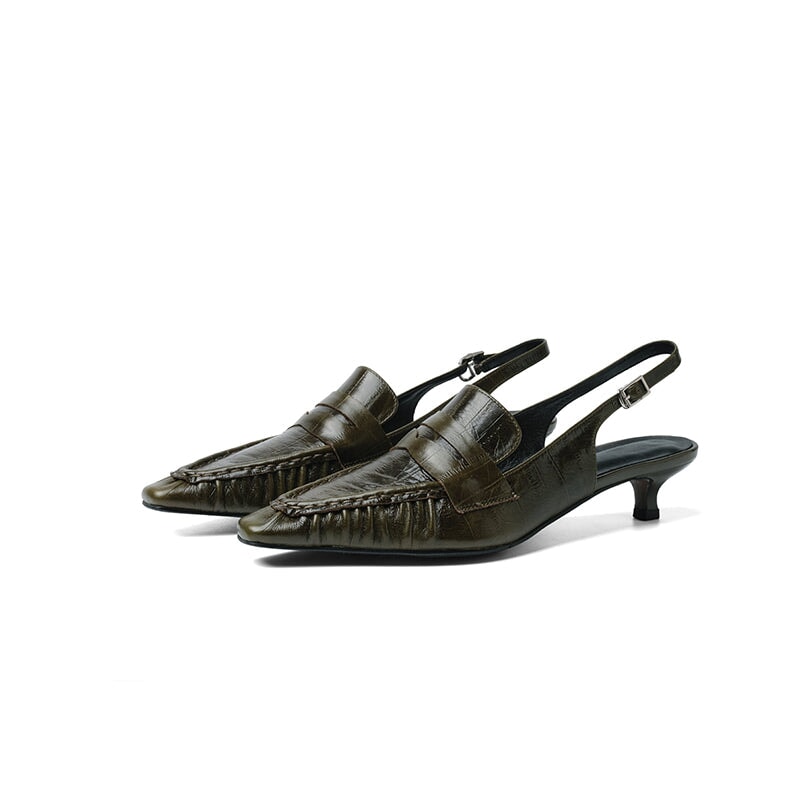 Square Toe Slingback Pumps Kitten Heel Ruched Leather Sandals in Black/Brown/Green