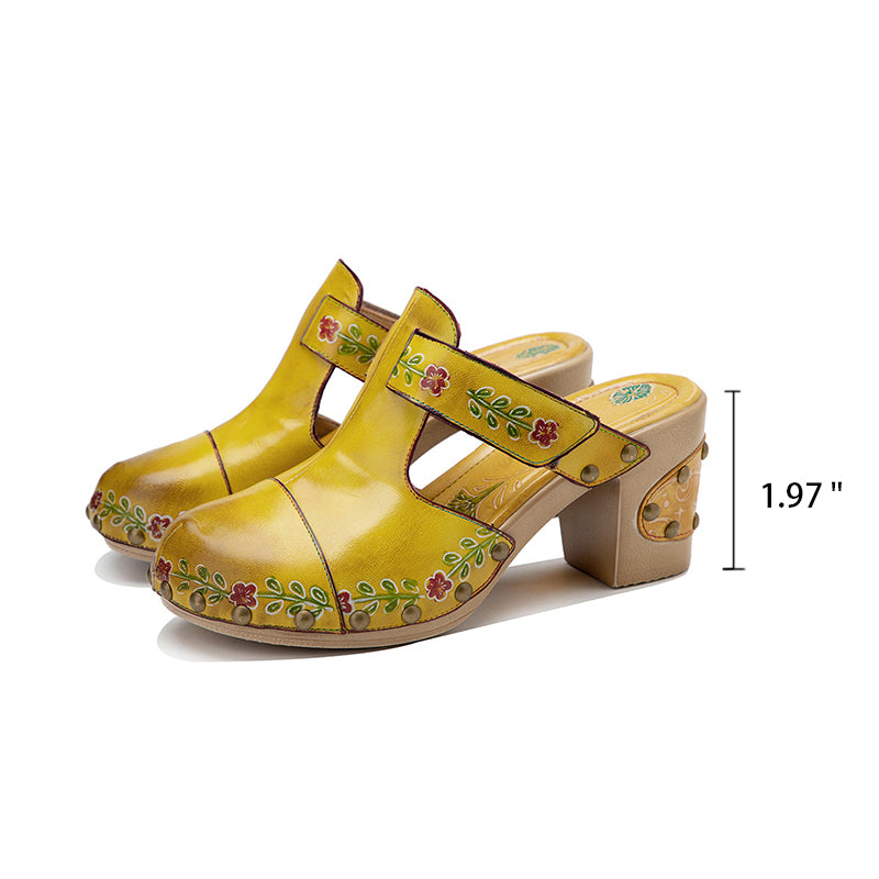 보헤미안 스타일, 꽃 장식 인쇄, 50mm 블록 힐, 레이저 조각, 수동 채색, 정밀 재봉 마킹 라인, 로맨틱 컬러, 독특한 아름다움을 입으십시오.