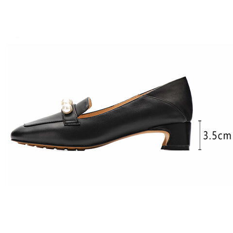 여성 진주 디테일 레더 로퍼 블랙/콩 페이스트