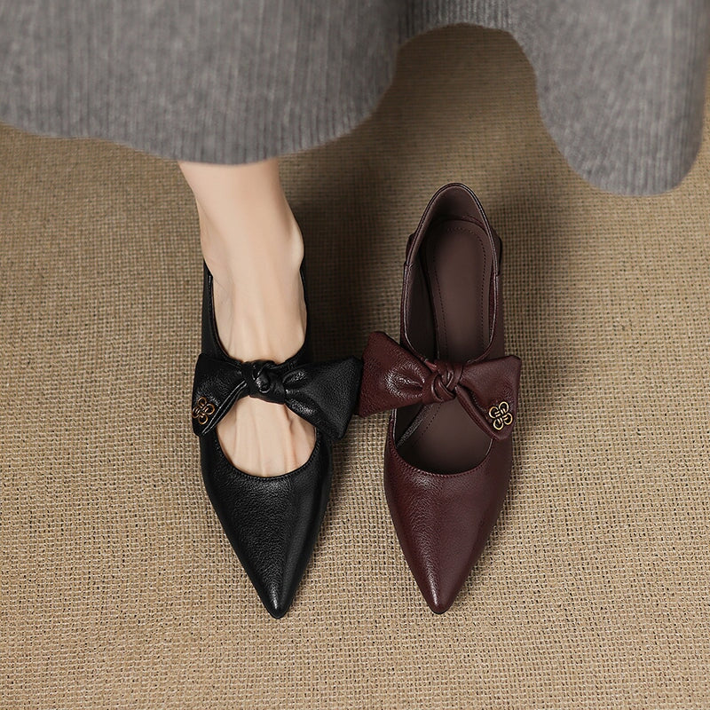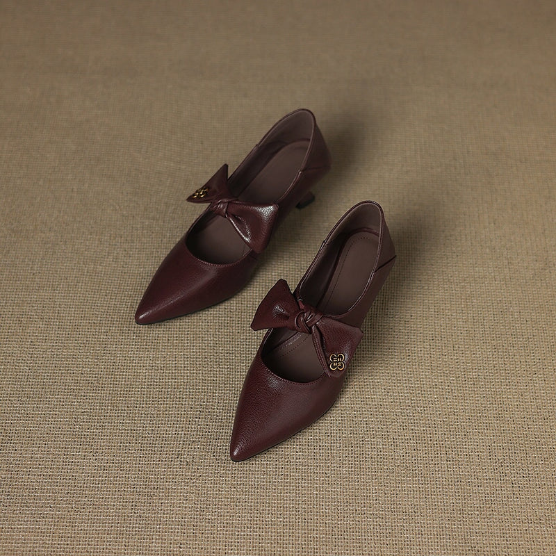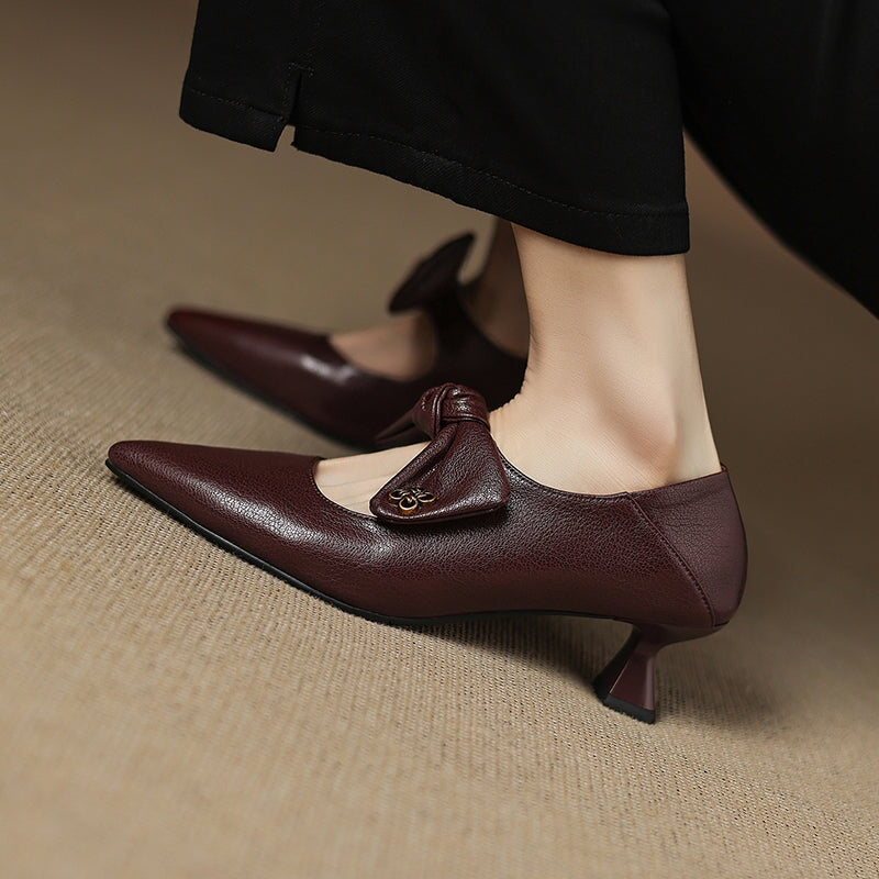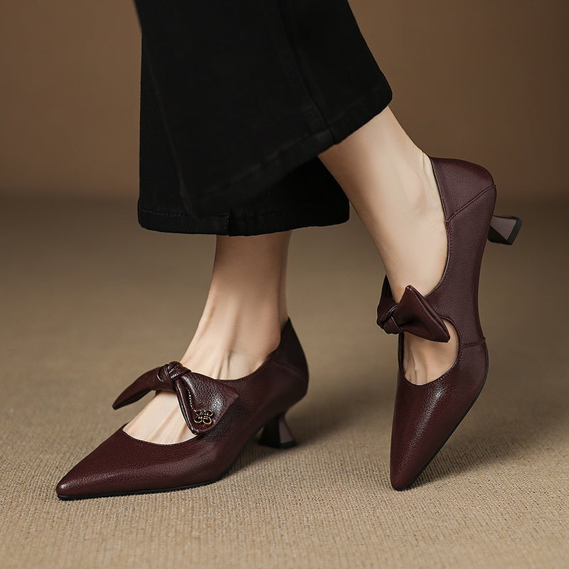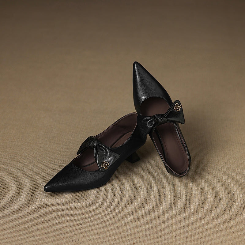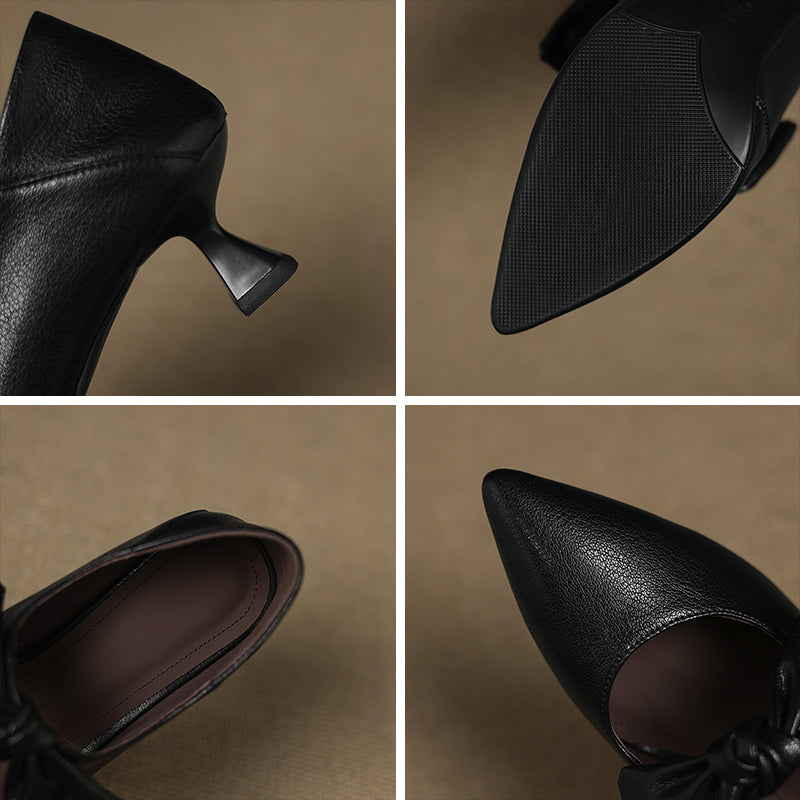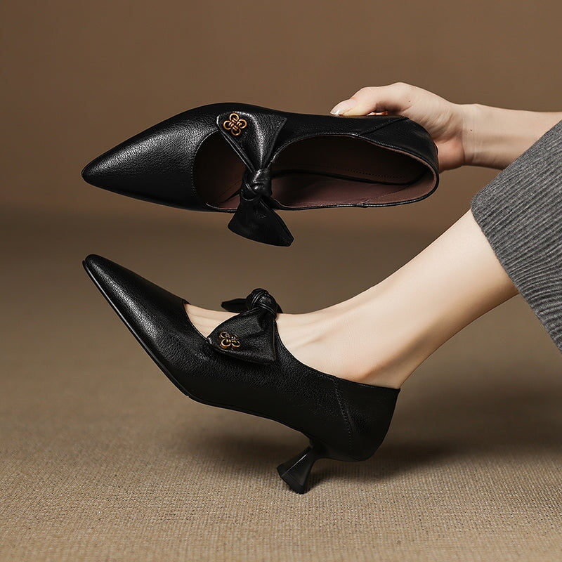 핸드메이드 소가죽 펌프스 여성 포인트 토 꽃 그레이 키티 힐