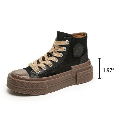 여성용 하이탑 레이스업 플랫 가죽 & 캔버스 스니커즈, 옐로우/블랙 컬러