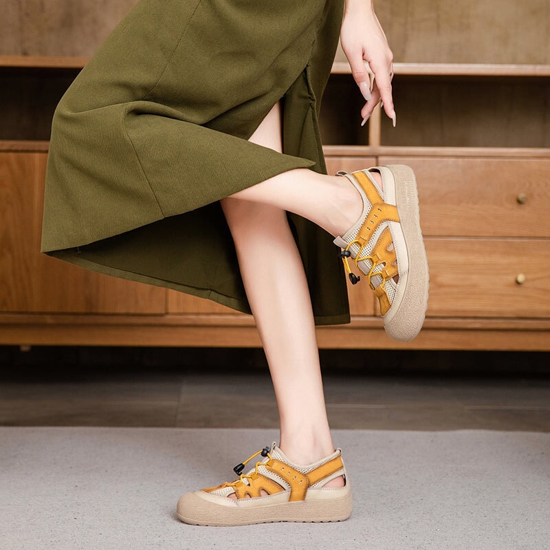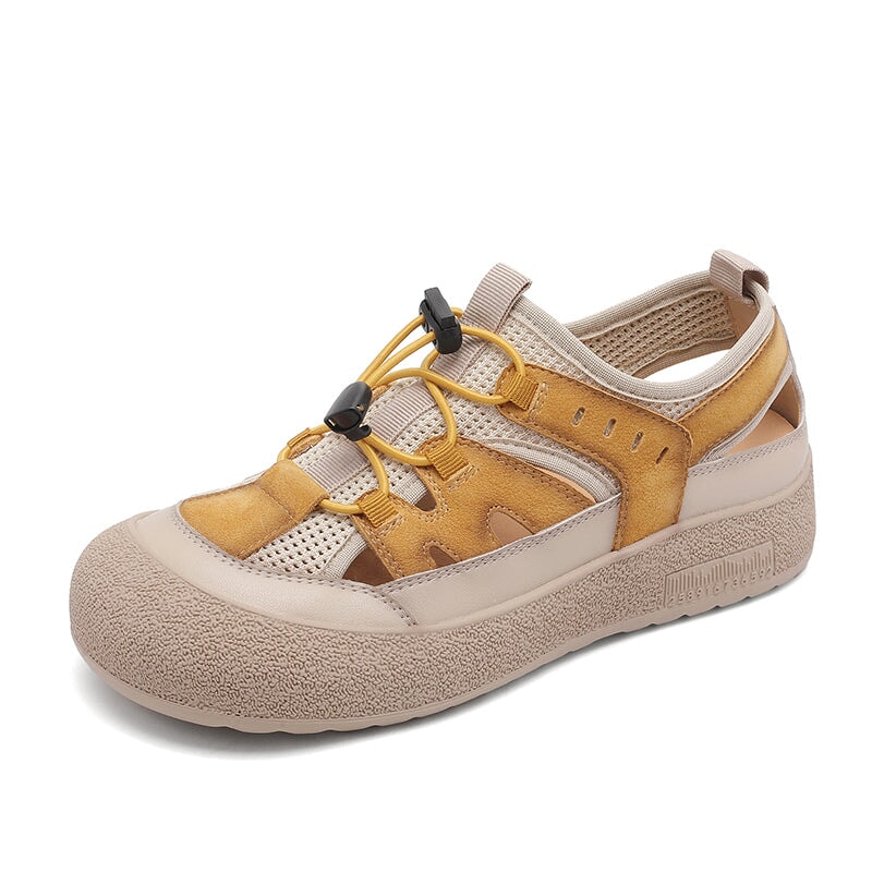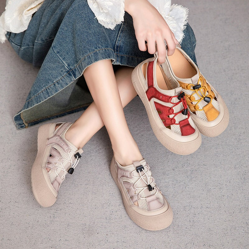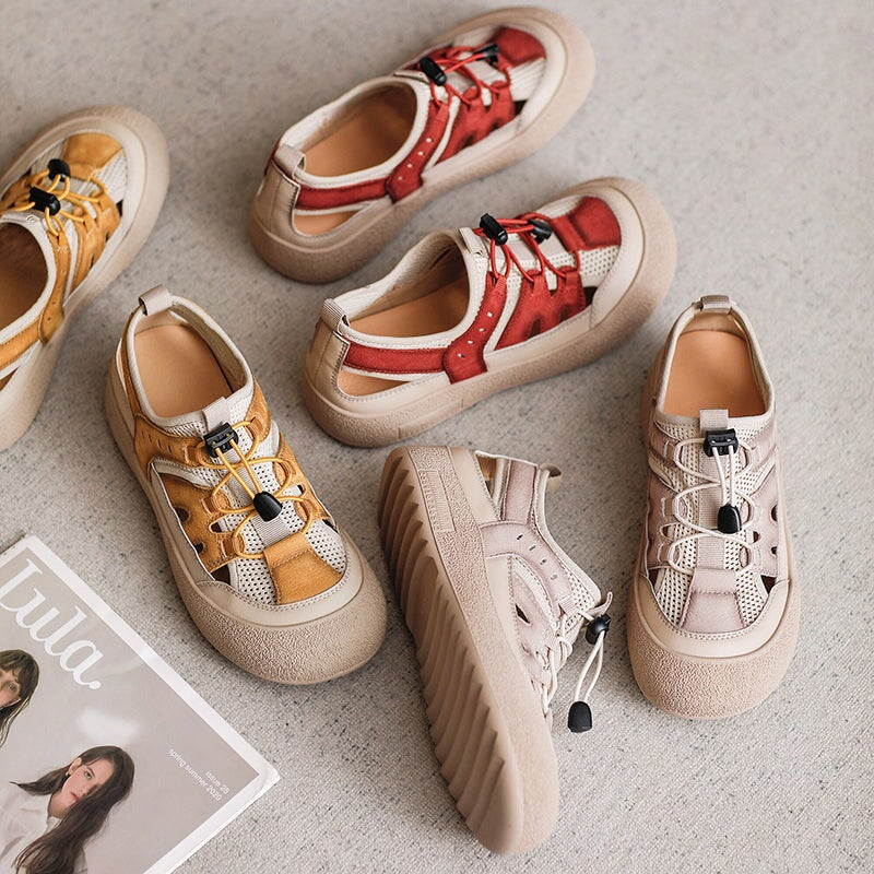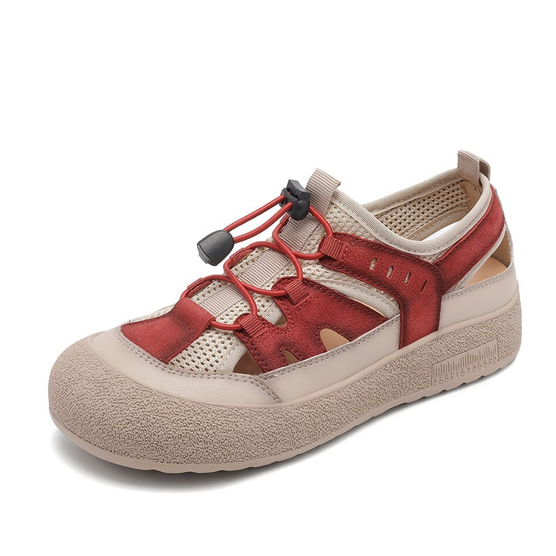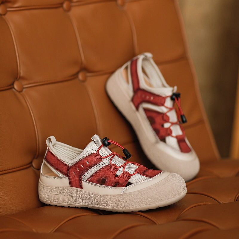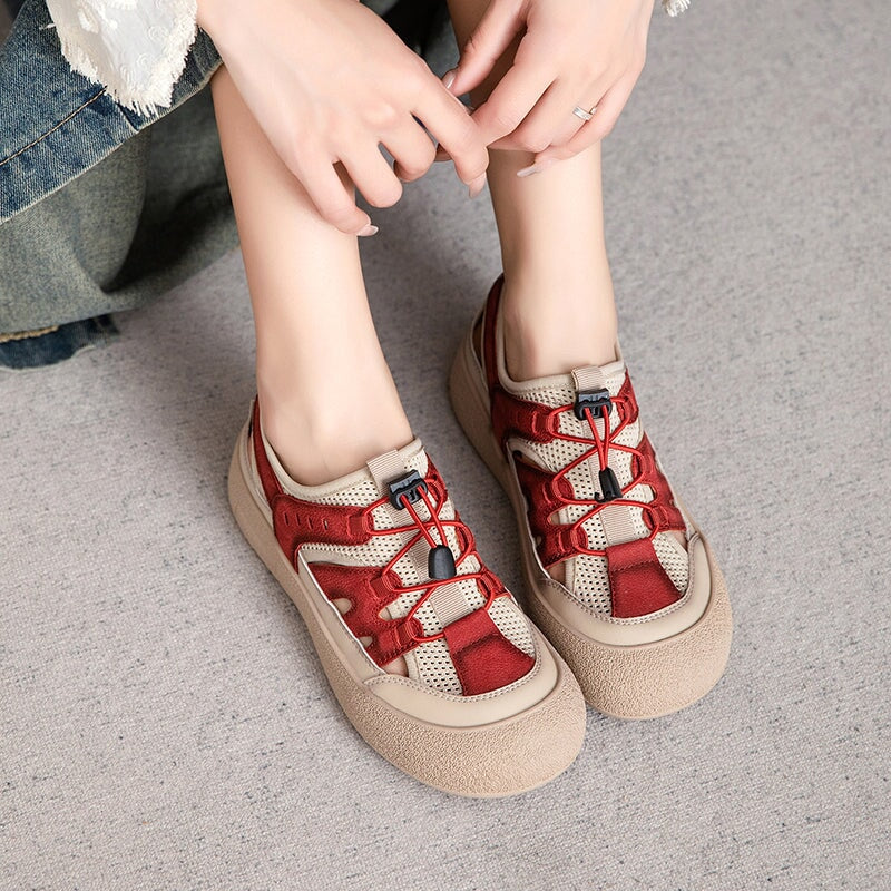 Casual Hollow-Out Leather Mesh Platform Sneakers in Beige/Yellow/Red