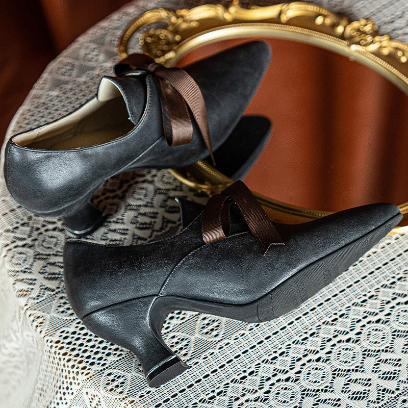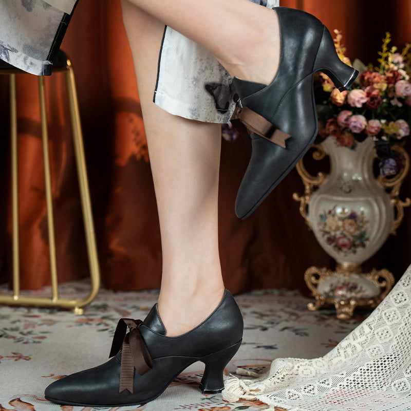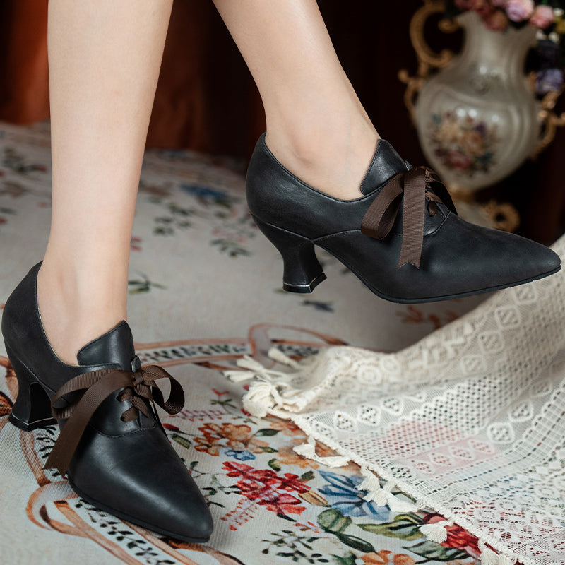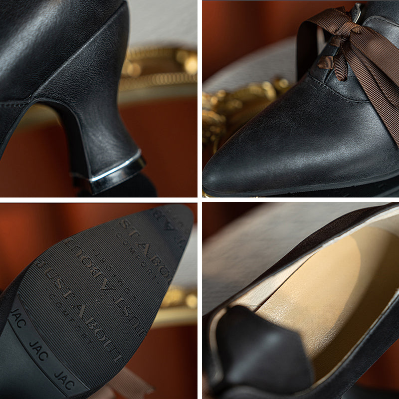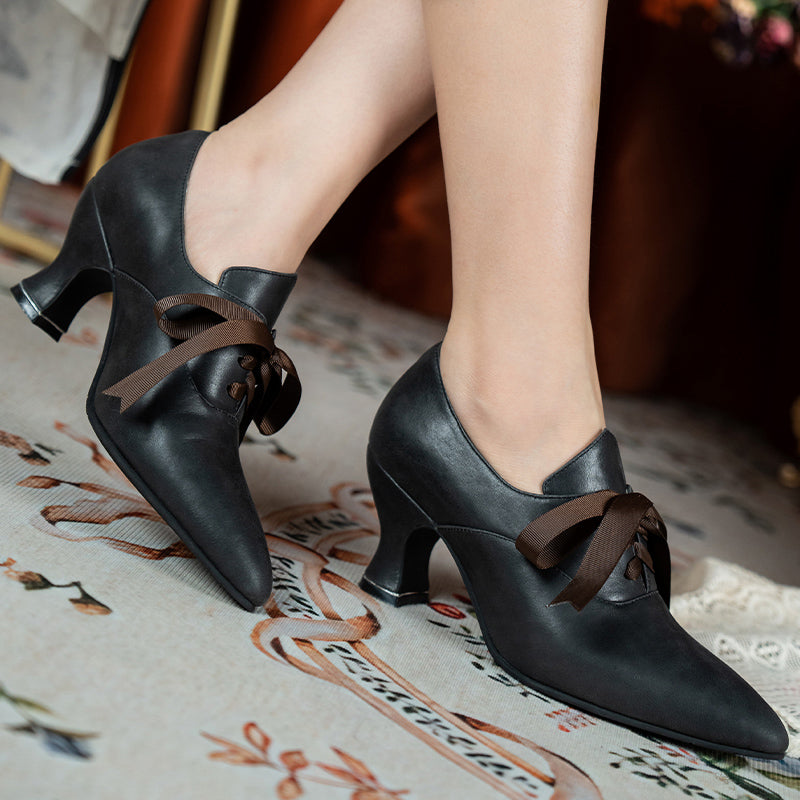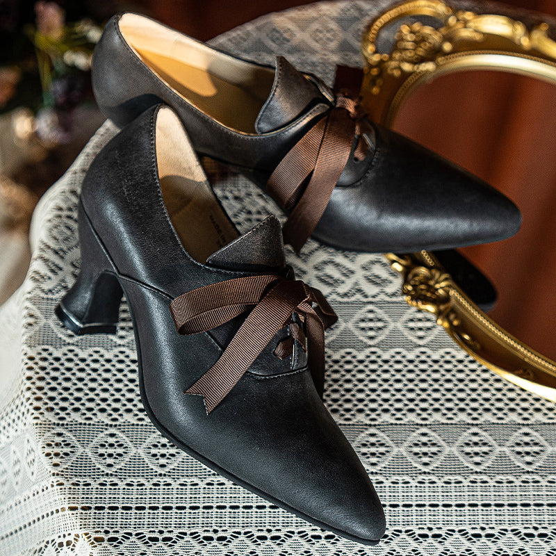 These Handmade Vintage Oxford Pumps are inspired by the elegance of the Edwardian era, made for everyday commuting with timeless retro charm. Crafted from matte soft cow leather, these pumps feature a sleek pointed toe, lace-up Oxford design, and a comfortable 70mm block heel for stability and sophistication. The rubber outsole ensures comfort and confident walking throughout the day. Perfect for work, vintage outfits, historical fashion, or Steampunk and Edwardian-inspired looks.