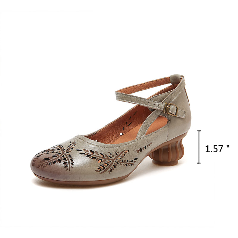레트로 컷 아웃 가죽 라운드 토 메리 제인 펌프스 여성용 앵클 스트랩 옐로우/그레이