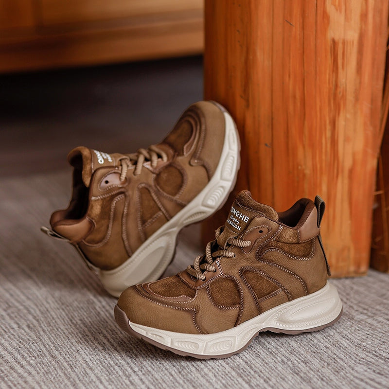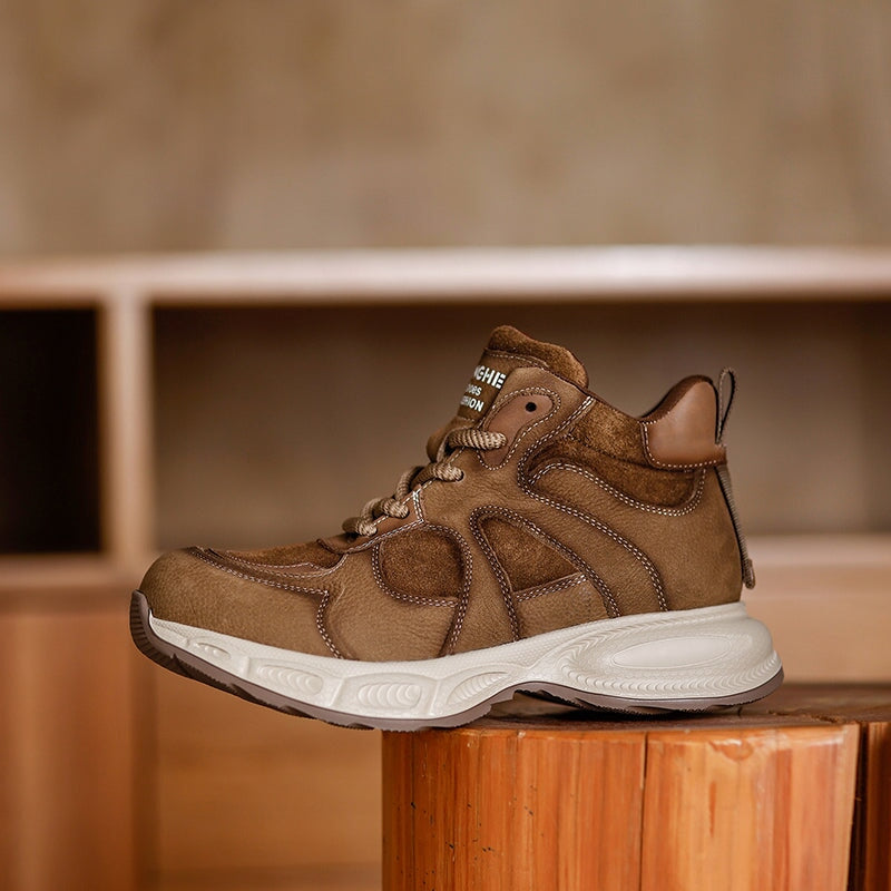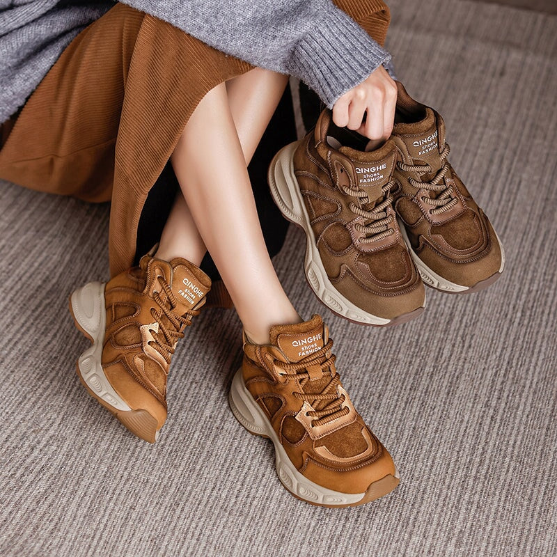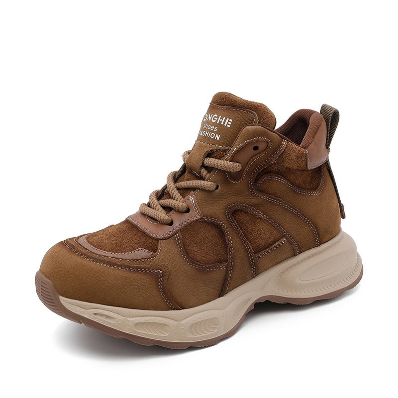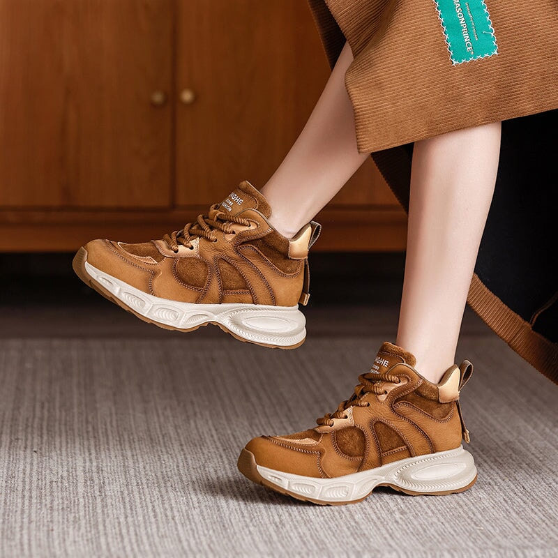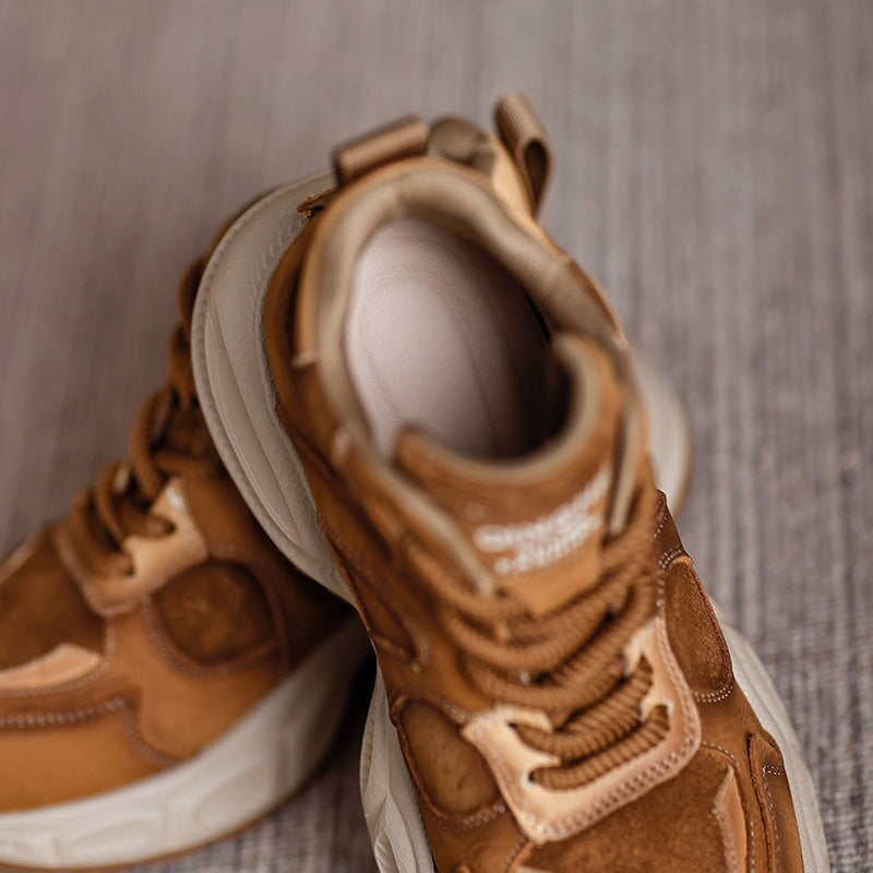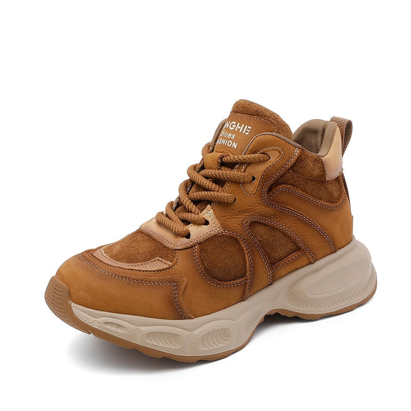 여성용 하이탑 레이스업 플랫 가죽 스니커즈 옐로우/브라운/블랙 고무 캡