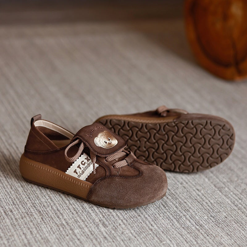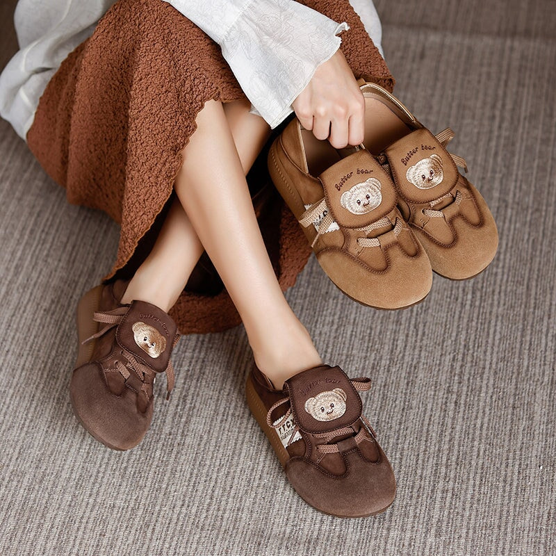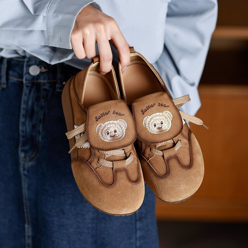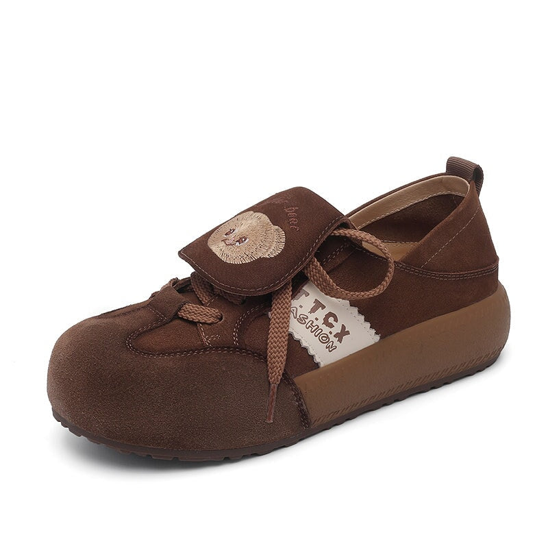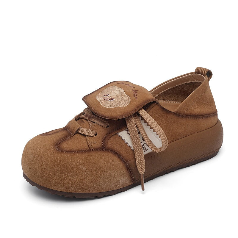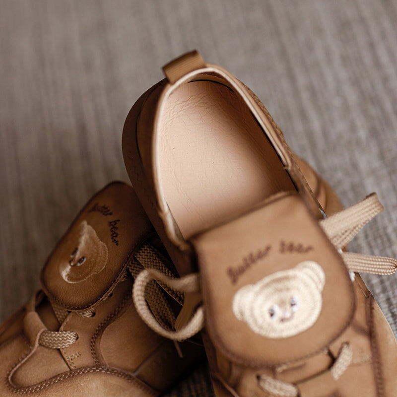 Mori Girl Cute Bear Embroidered Leather Sneakers Campus Casual Styles in Khaki/Brown