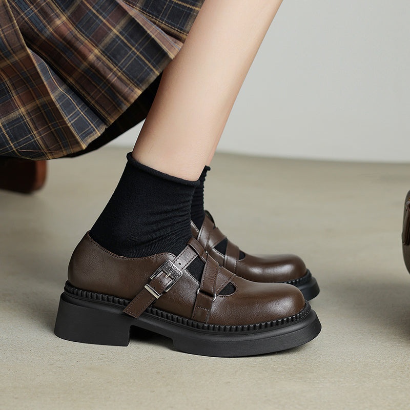 가죽 더블 T 스트랩 메리 제인 슈즈 라운드 토 50mm 블록 힐 브라운/블랙