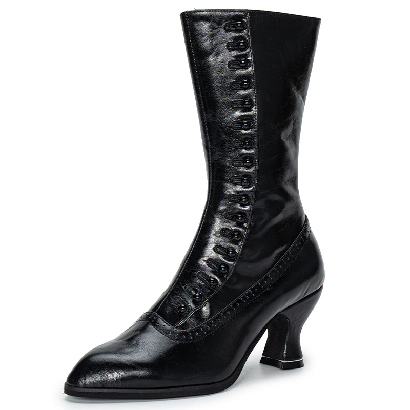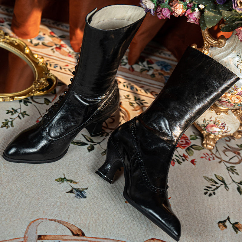 Step back into the elegance of the late Victorian and Edwardian eras with these exquisite handmade button boots. Crafted from soft waxed cow leather and supple nappa leather, these mid-calf boots feature a historically accurate 17-button closure for true period charm. The pointed toe, brogue detailing, and graceful 70mm spool heel evoke timeless sophistication, while the rubber sole ensures comfort and durability. Perfect for vintage enthusiasts, dark academia lovers, cottagecore outfits, or historical reenactments these boots not only look authentically antique but let you feel the elegance of the past with every step.