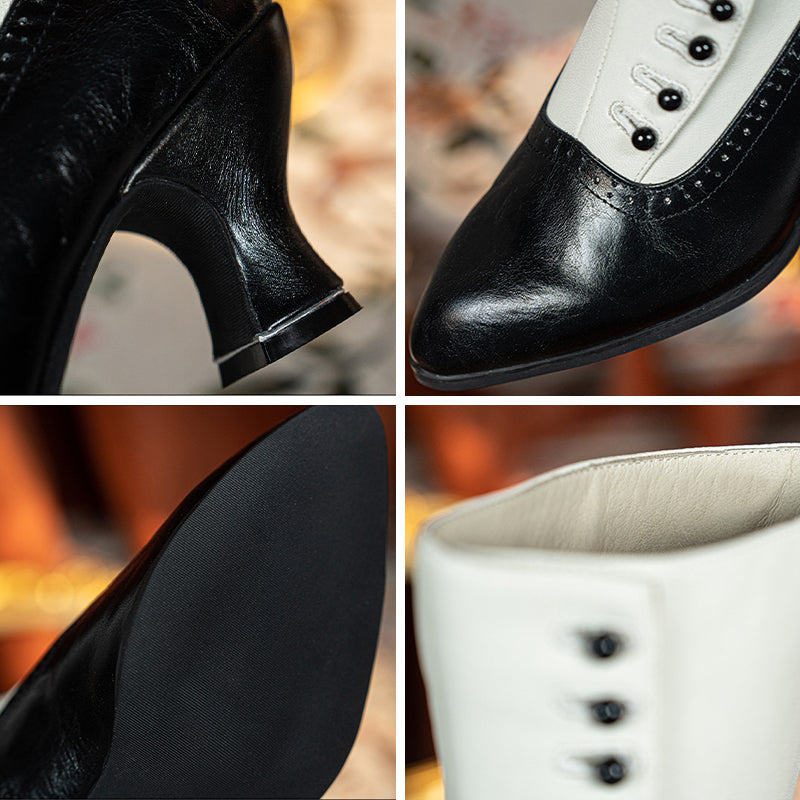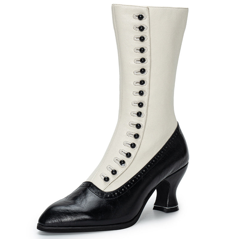 Vintage Edwardian Button Boots for Women Soft Leather Mid-Calf Brogue Boots in Black and White/Black