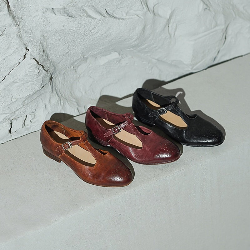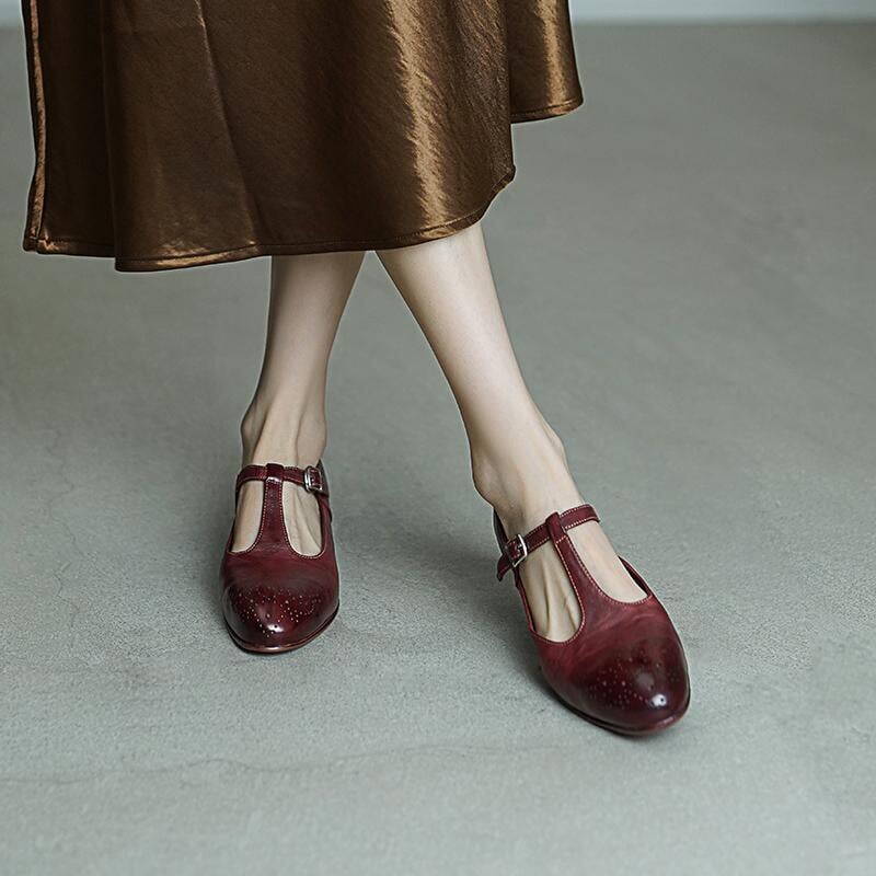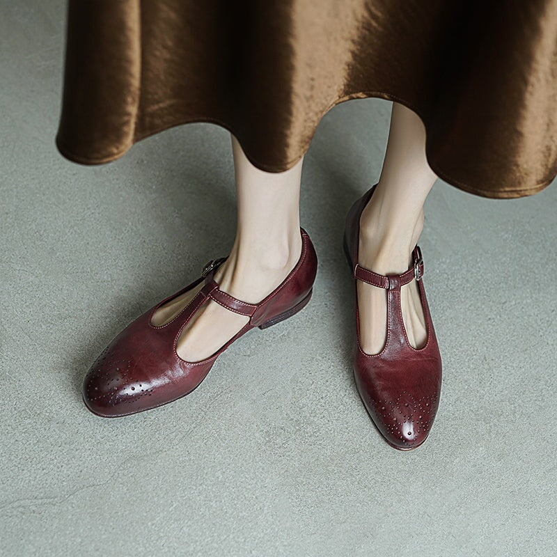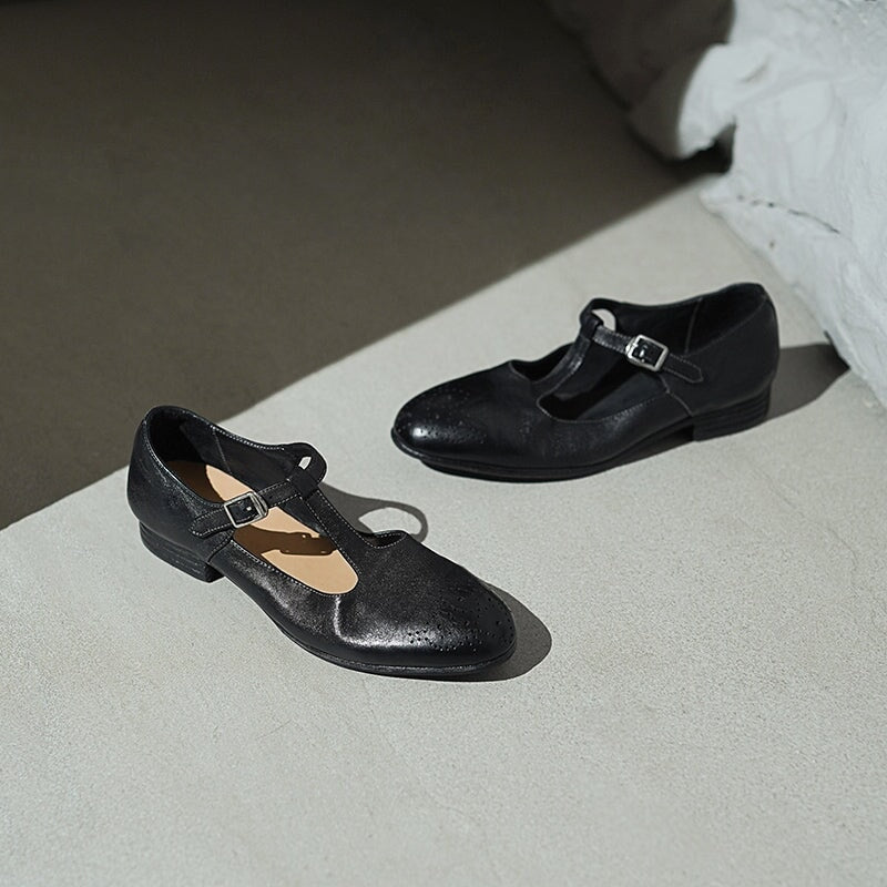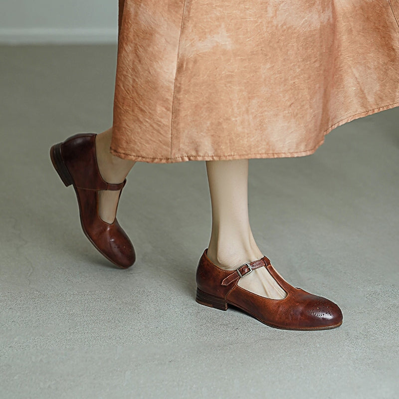 These Vintage T-Strap Brogue Mary Jane Shoes feature a classic round toe design, intricate brogue details, and a secure buckle closure. Crafted from premium washed horse leather, they combine a soft texture with durable quality. The low block heel ensures comfort for all-day wear, making them perfect for casual outings or vintage-inspired looks. Available in timeless colors, these shoes offer a blend of elegance, practicality, and retro charm.
