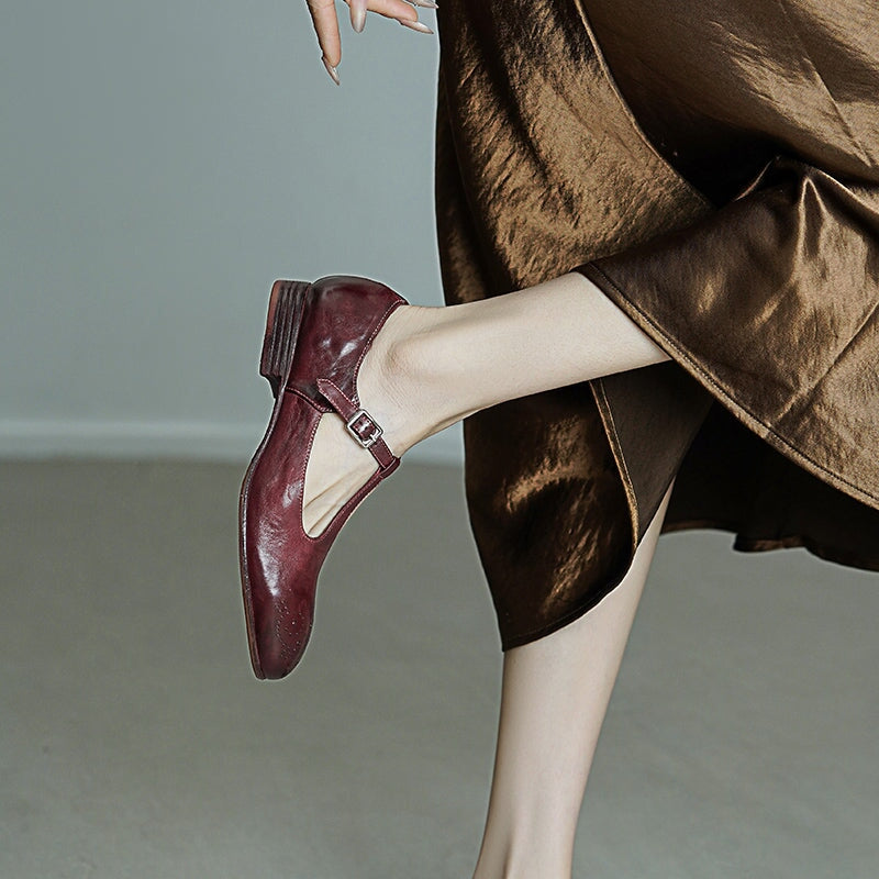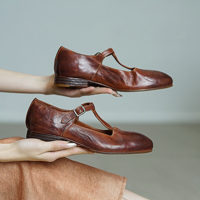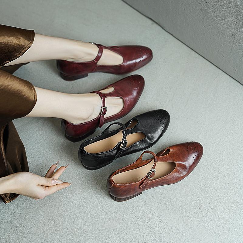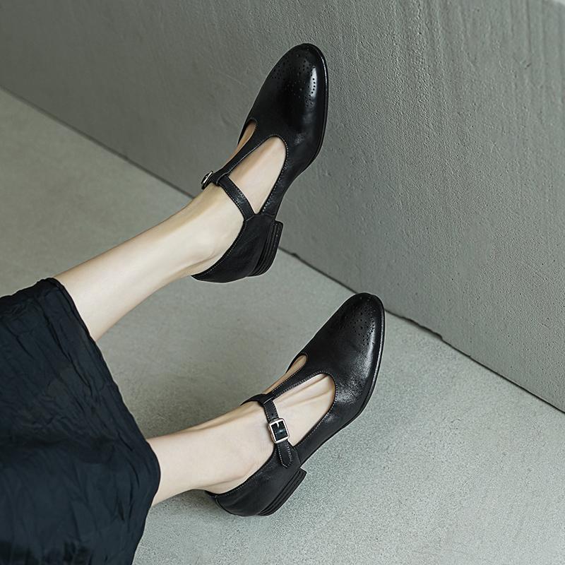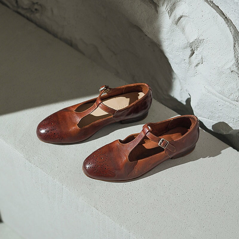 These Vintage T-Strap Brogue Mary Jane Shoes feature a classic round toe design, intricate brogue details, and a secure buckle closure. Crafted from premium washed horse leather, they combine a soft texture with durable quality. The low block heel ensures comfort for all-day wear, making them perfect for casual outings or vintage-inspired looks. Available in timeless colors, these shoes offer a blend of elegance, practicality, and retro charm.