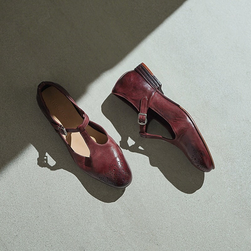 Vintage Washed Horse Leather T-Strap Brogue Mary Jane Shoes in Red/Black/Brown