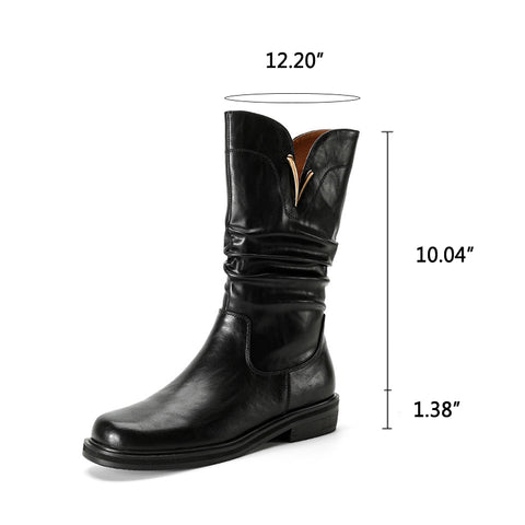 오프닝의 더블 V 및 접이식 튜브 미드 카프 부츠. 패션 스타일 라운드 발가락. 편안하고 긴 다리를 뽐내세요.