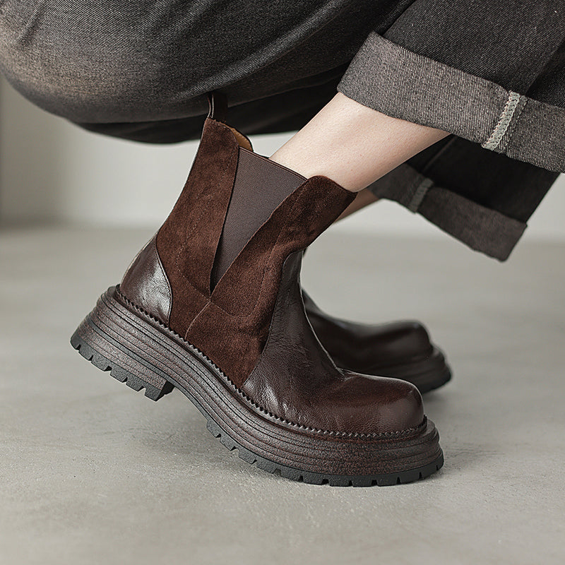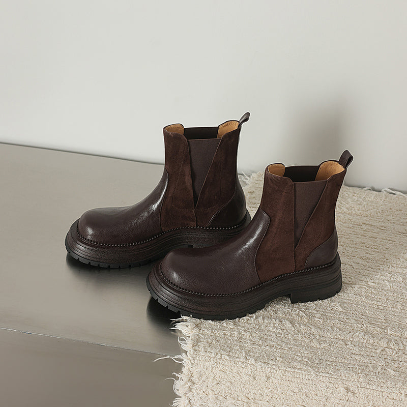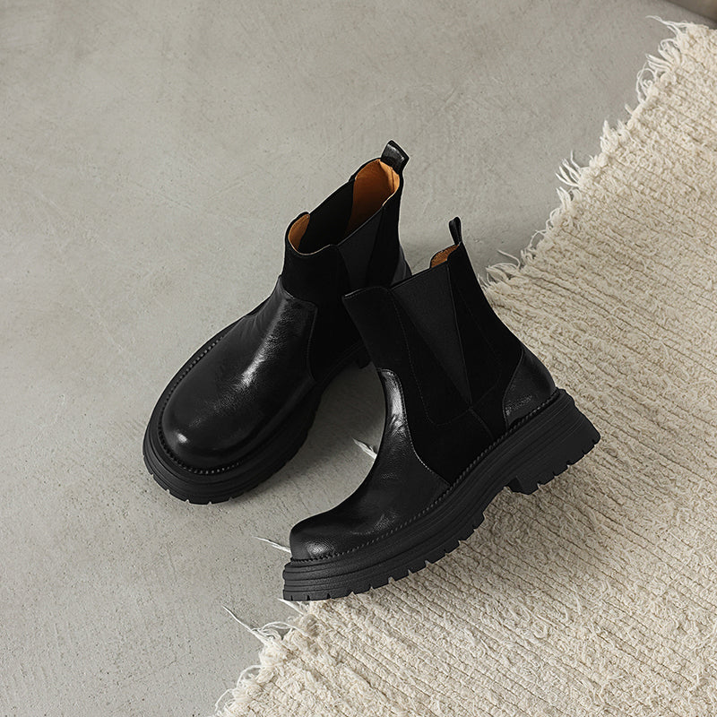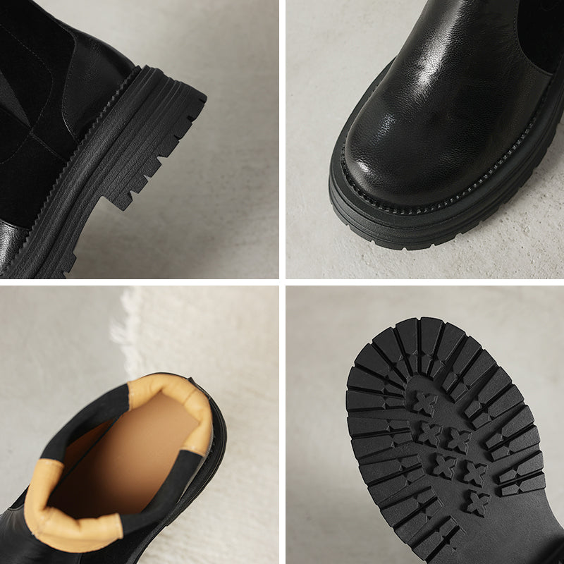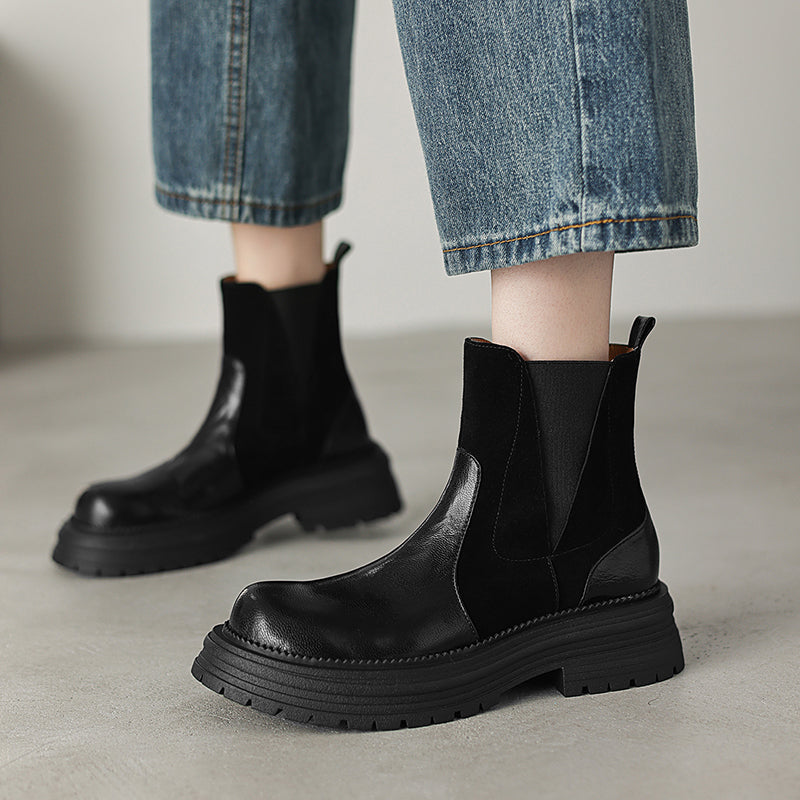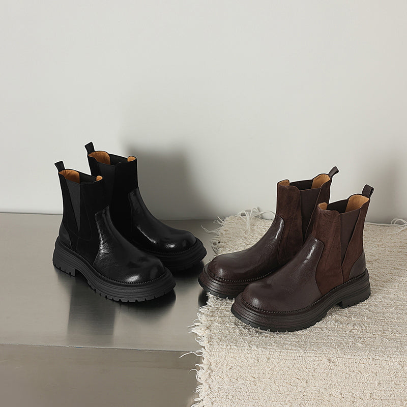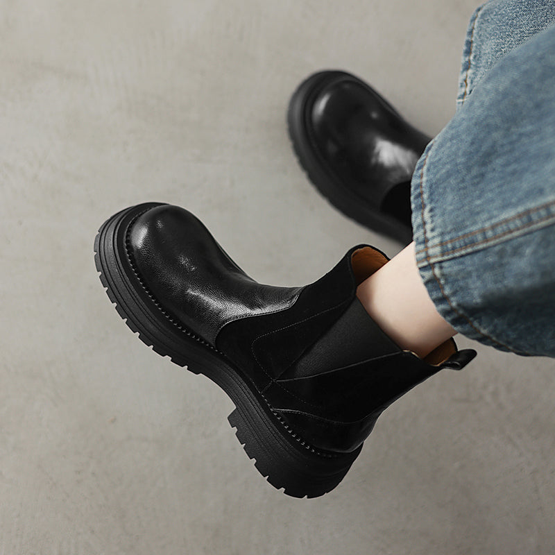 Step into timeless style with these chunky platform Chelsea boots, crafted from premium top-layer cow leather for a classic yet modern look. Featuring a smooth round toe, stretchy side panels, and a sturdy 50mm block heel, these short boots blend vintage charm with everyday practicality. The durable TPR outsole provides excellent grip and comfort, while the elevated platform adds height without sacrificing stability. A versatile wardrobe essential for casual, chic, and retro-inspired outfits.