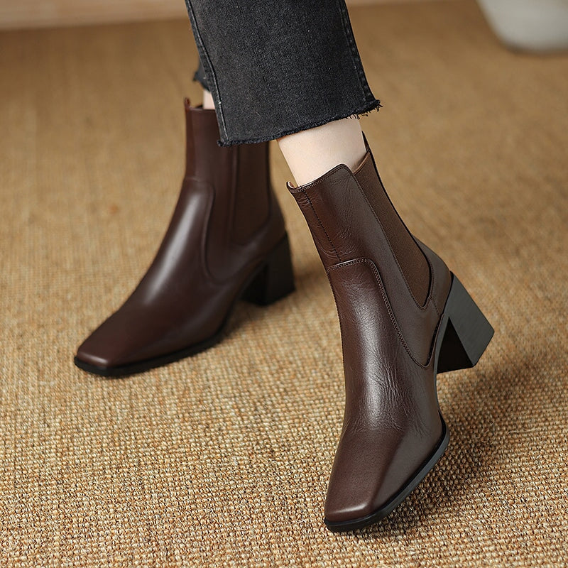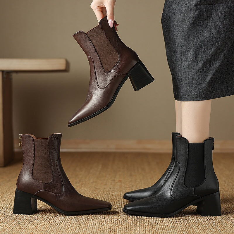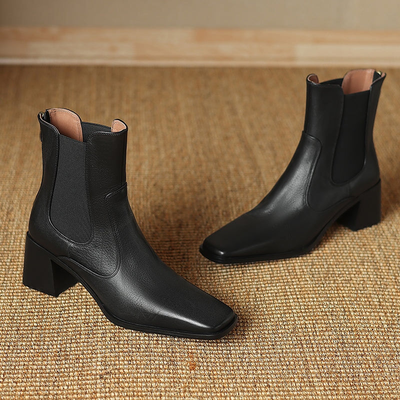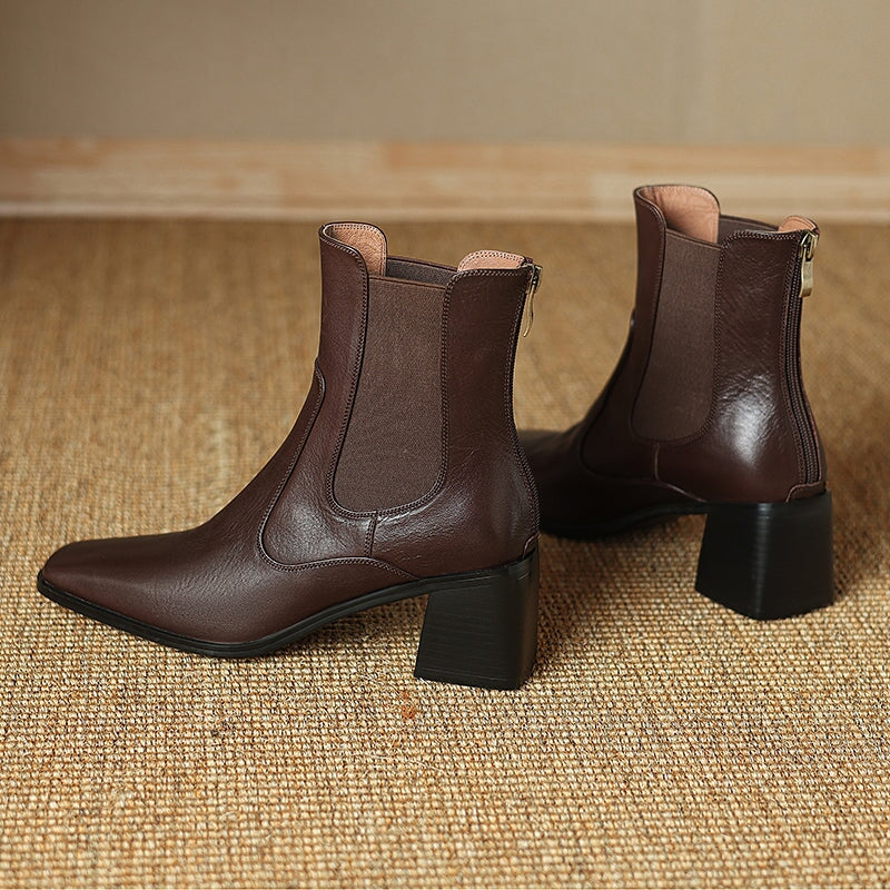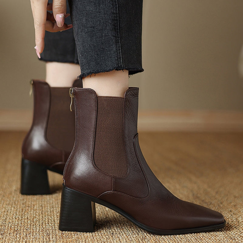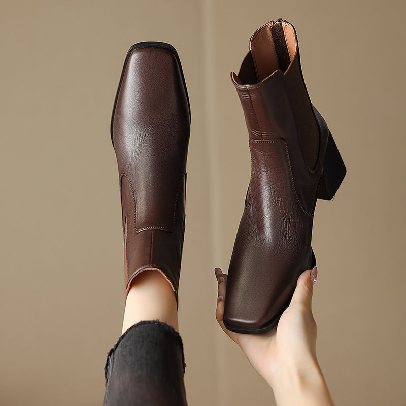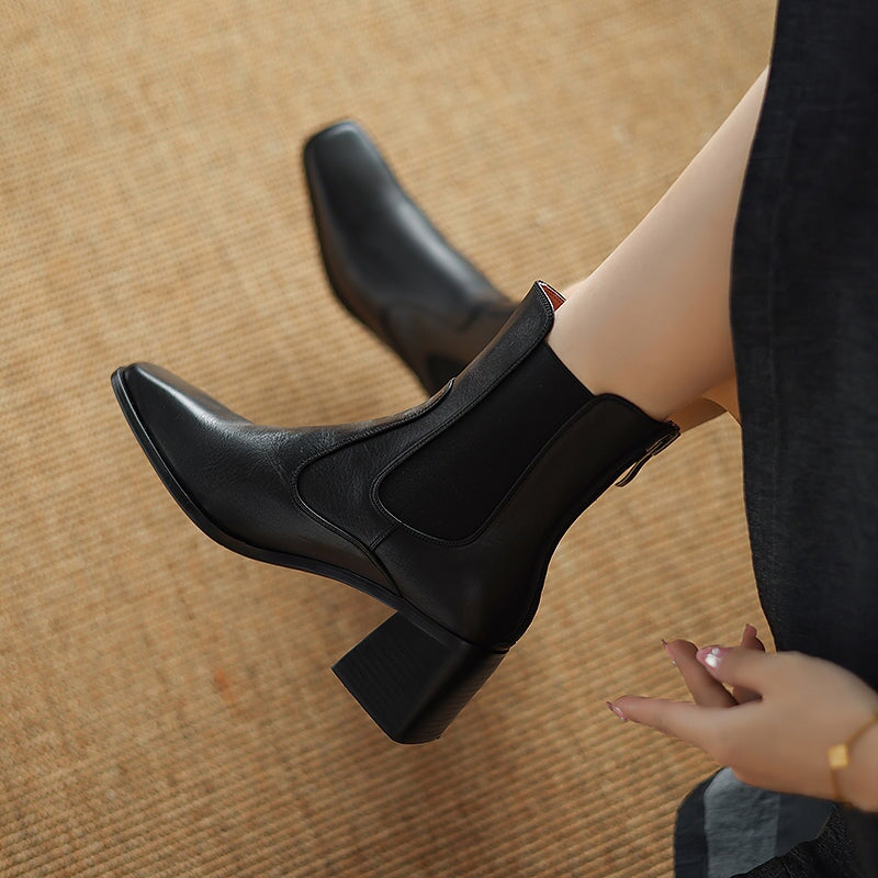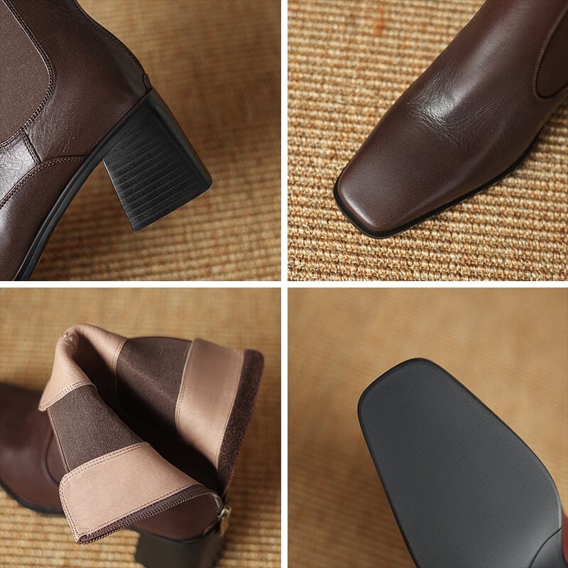 These women’s vintage Chelsea boots feature a chic square toe and a stable 60mm block heel for a flattering yet comfortable lift. Crafted from premium water-washed cow leather, they offer a soft, natural texture with a timeless look. The convenient back zipper makes them easy to slip on and off, while the durable rubber outsole provides reliable grip for daily wear. Designed for year-round versatility, they are available with short plush lining for added warmth in winter or breathable leather lining for milder seasons.