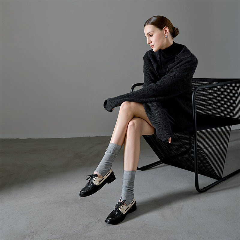 British Style Leather Boat Shoes for Women Contrast Color Lace-Up Loafers in Black/Brown