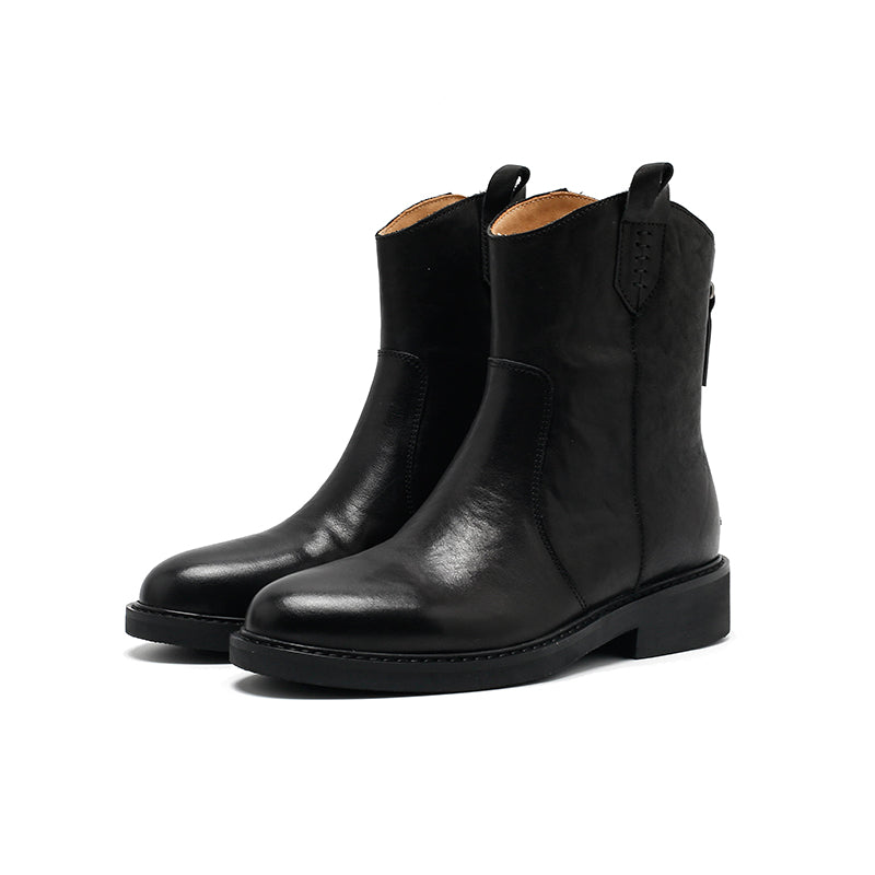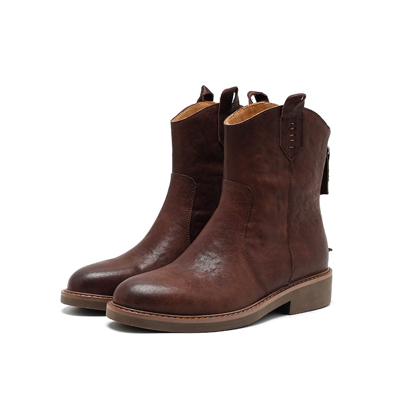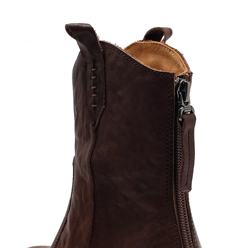 Step into timeless retro style with the Dwarves western short boots, handcrafted from premium top-grain vegetable-tanned cowhide. Designed with a western toe, sturdy block heel, and convenient back zipper, these boots blend casual fashion with everyday practicality. The high-elastic rubber sole is soft, non-slip, and wear-resistant, ensuring comfort and durability. Available with leather lining or short plush lining for versatile wear in all seasons. Each pair is carefully crafted by skilled shoemakers for quality that lasts for years.