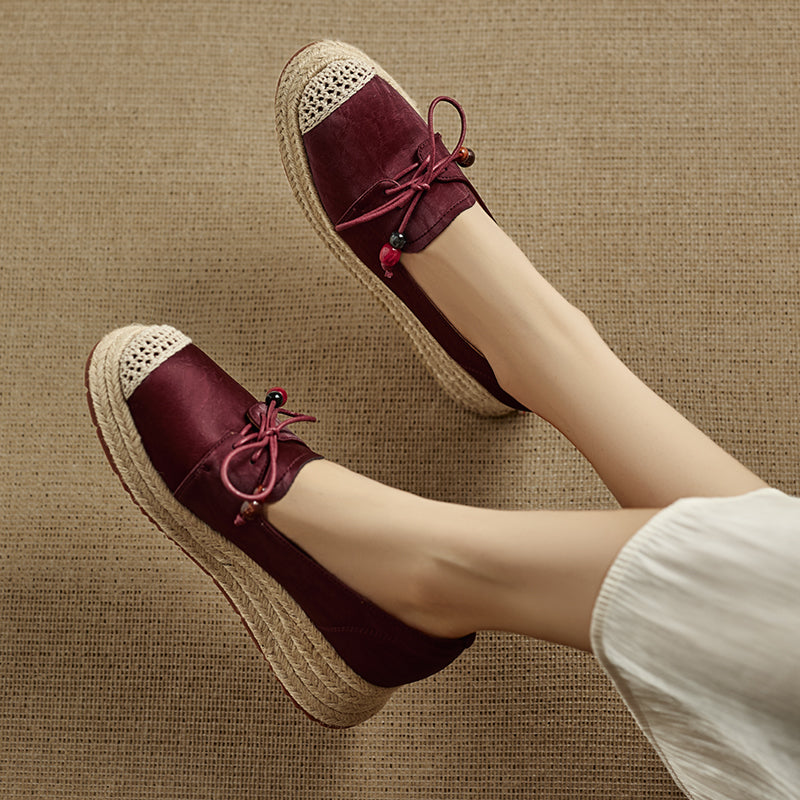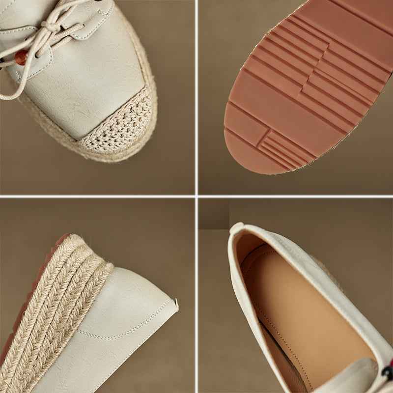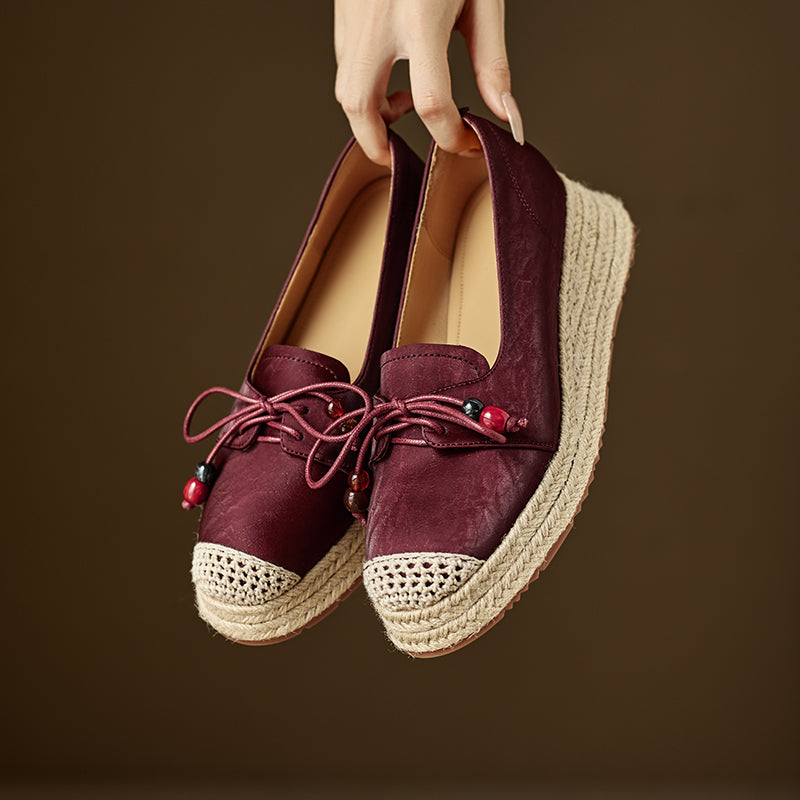 Casual Vintage Leather Espadrille Loafers for Women Lace-Up Wedge Shoes in Black/Wine Red/Beige Grey