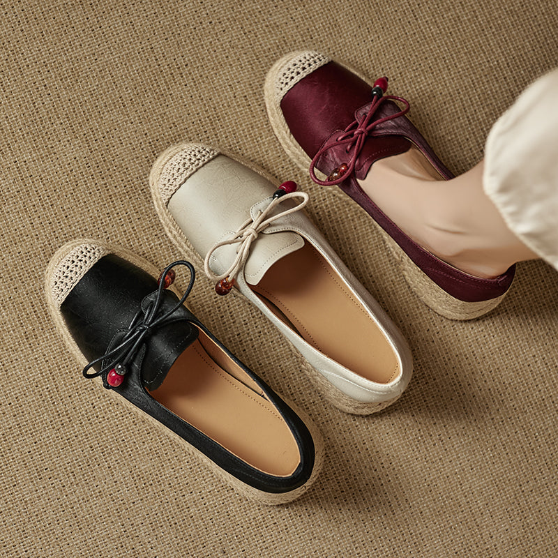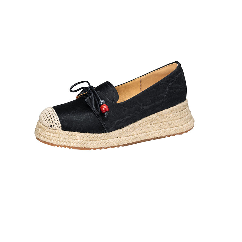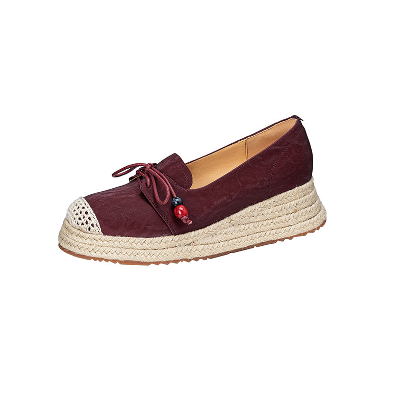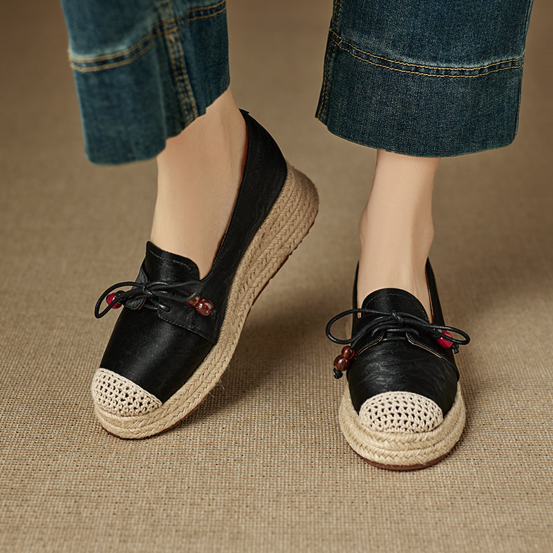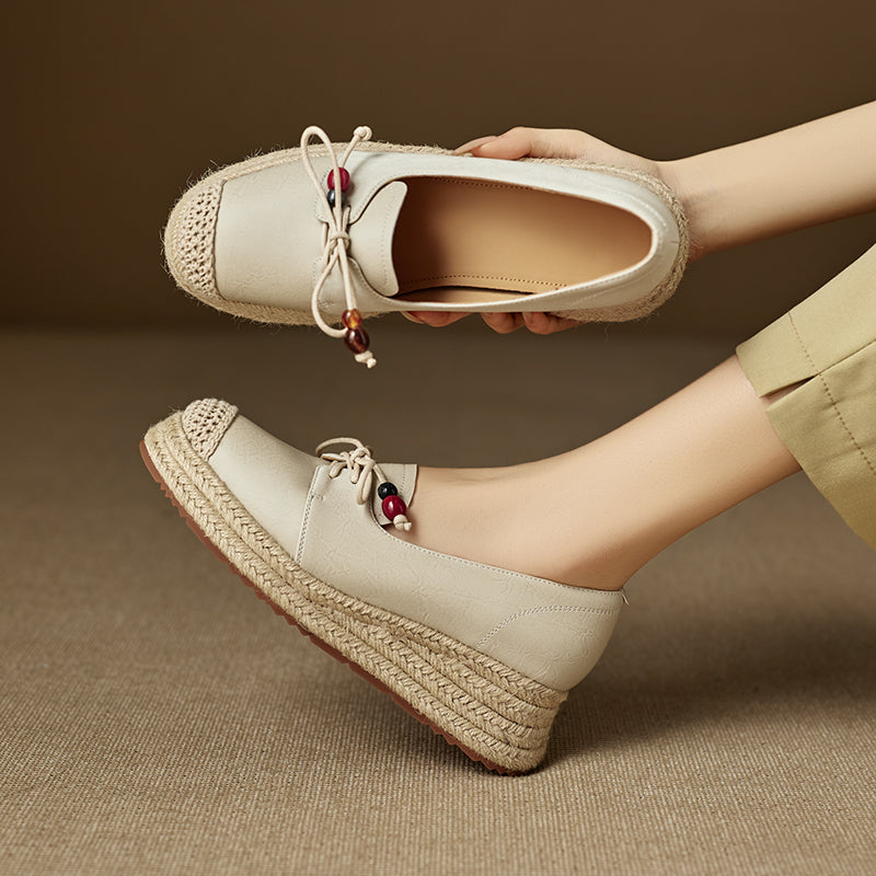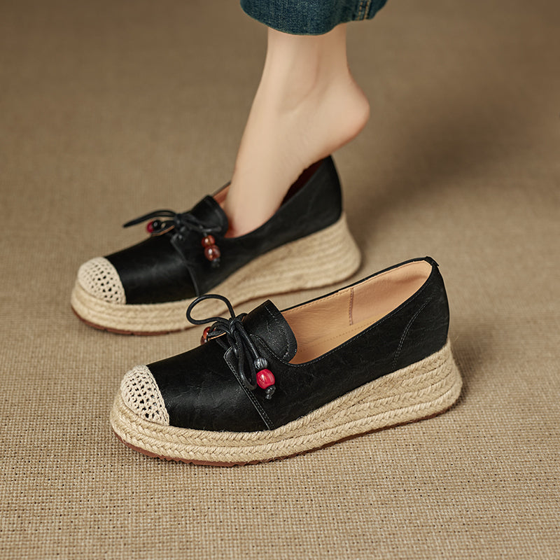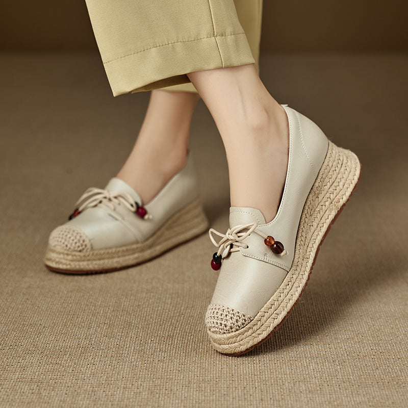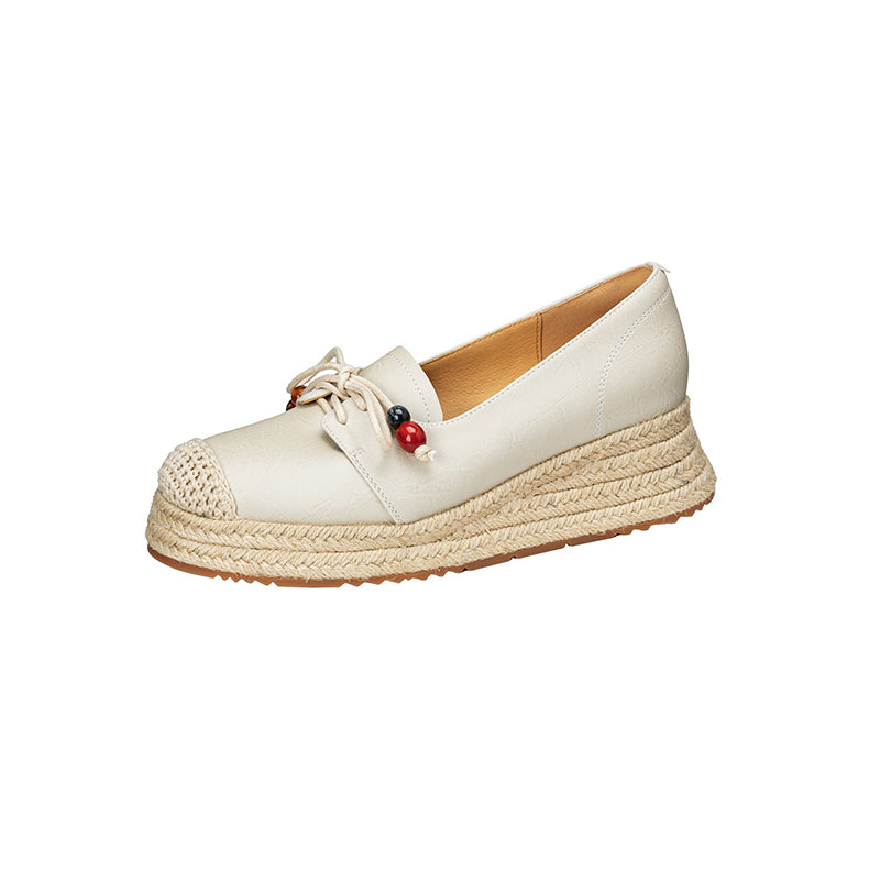 These casual espadrille loafers blend vintage flair with modern comfort. Made from genuine leather, they feature a round toe, lace-up front with decorative beaded bow, and a handwoven-style cap toe for added texture. The 50mm wedge sole is crafted from durable polyurethane with a natural grass-woven look, providing height without sacrificing comfort. A stylish choice for laid-back days, travel, or adding an artisanal touch to any outfit.