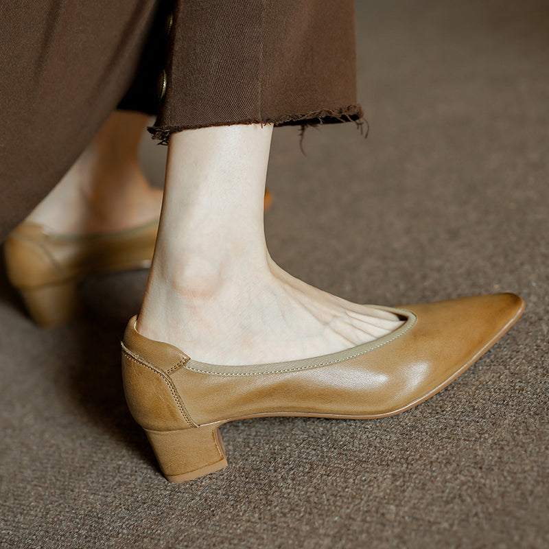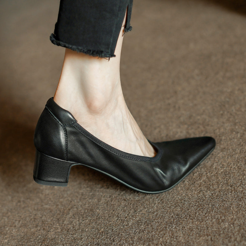 Elegant handmade pumps crafted from premium full-grain cow leather with a sleek pointed toe and 40mm block heel. The rubber sole is soft, elastic, non-slip, and wear-resistant. Each pair is carefully handcrafted by skilled artisans �durable, timeless, and perfect for formal or everyday wear.