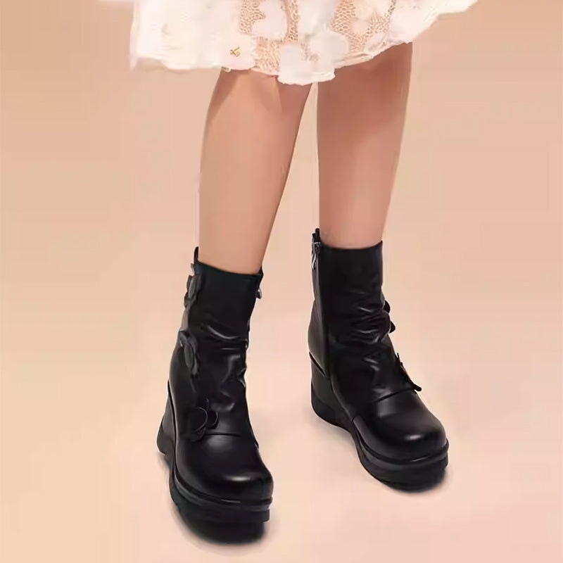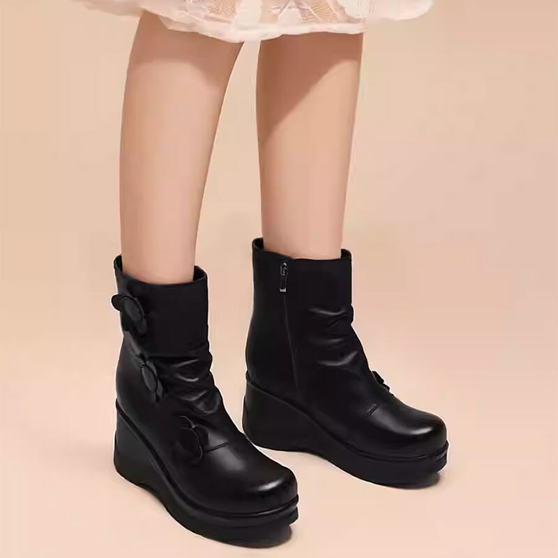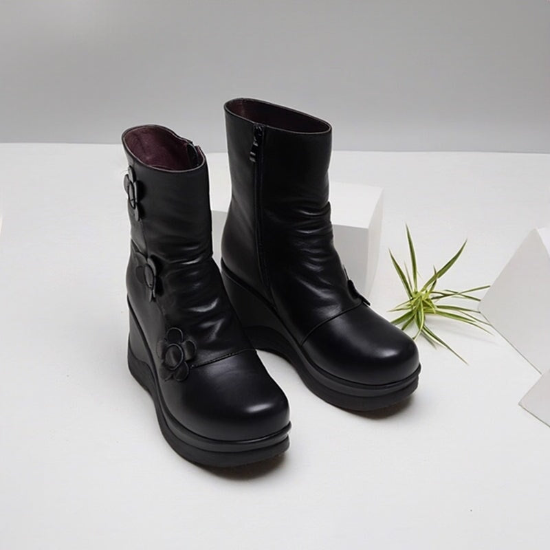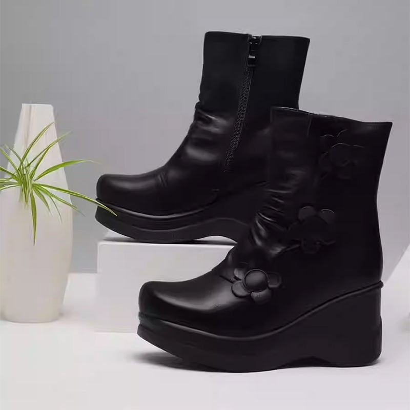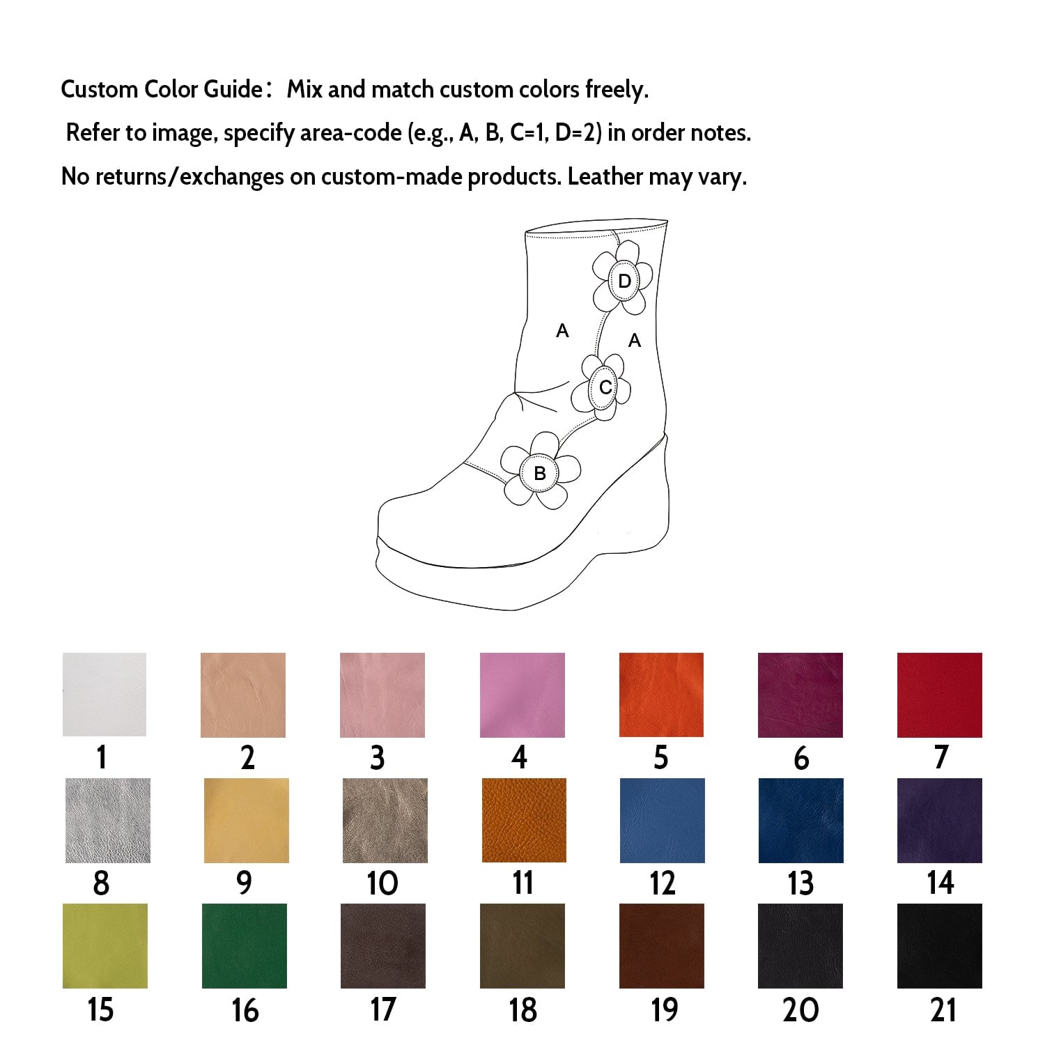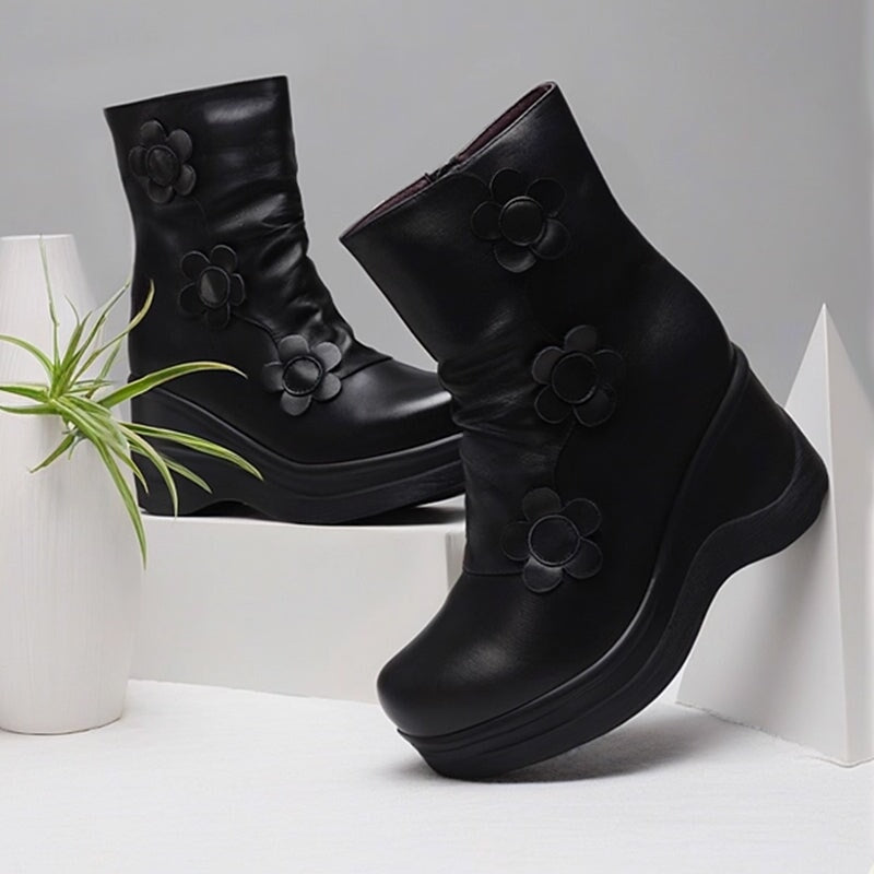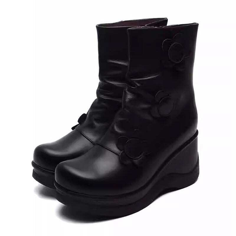 Custom Color Women’s Handmade Leather Wedge Platform Short Boots with Flower Decor in Black