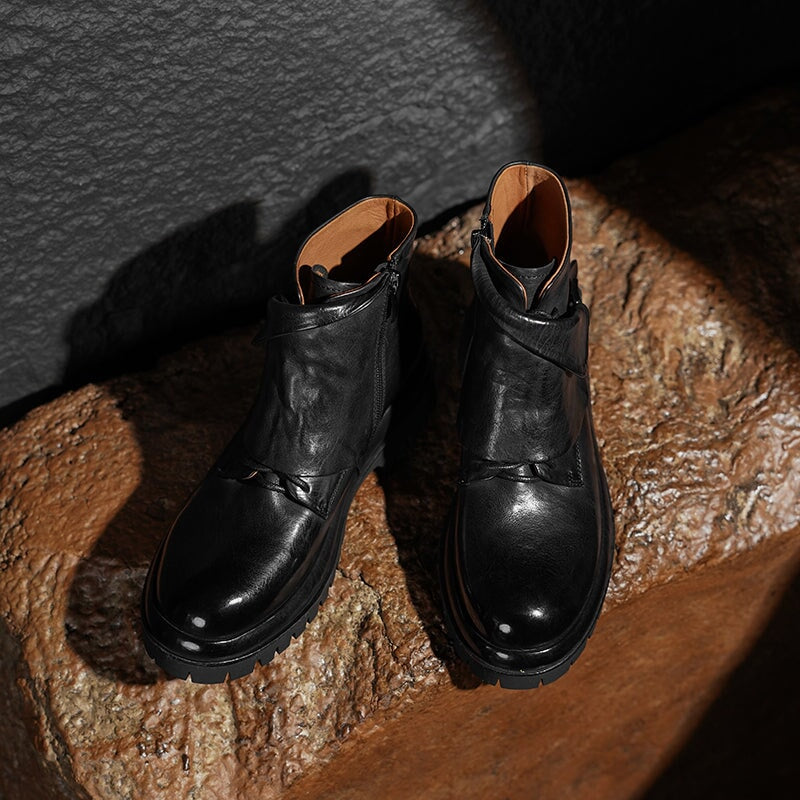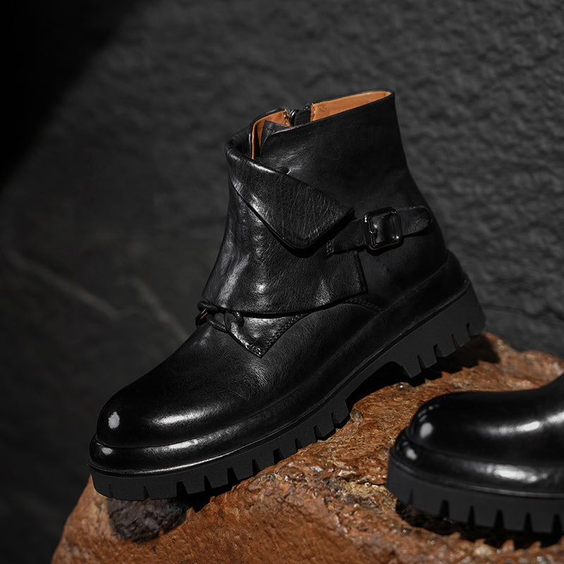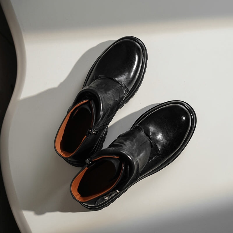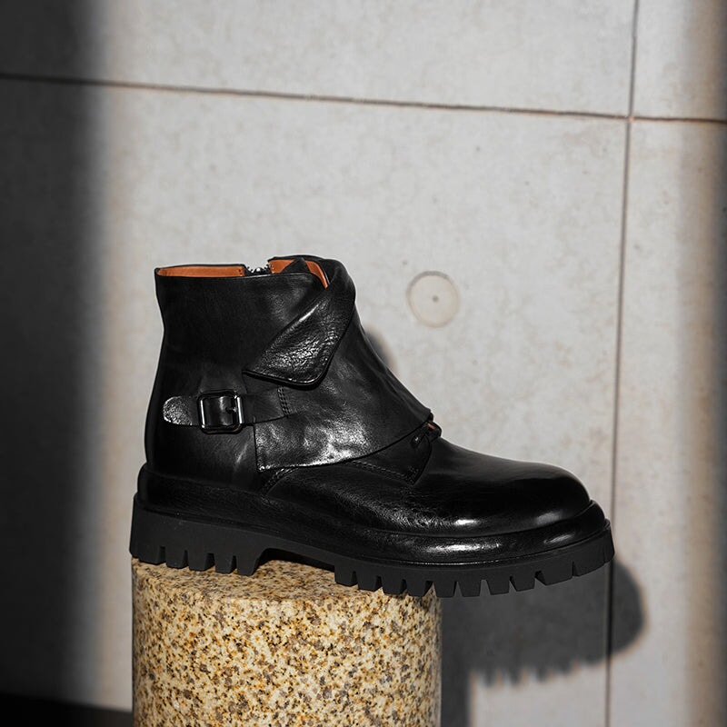 Crafted from premium cowhide leather, these stylish short boots feature a round toe, side zip, and decorative buckle for a chic designer look. The platform rubber sole with block heel ensures comfort and durability, while the modern fashion design makes them perfect for casual wear or statement outfits.
