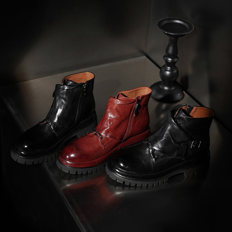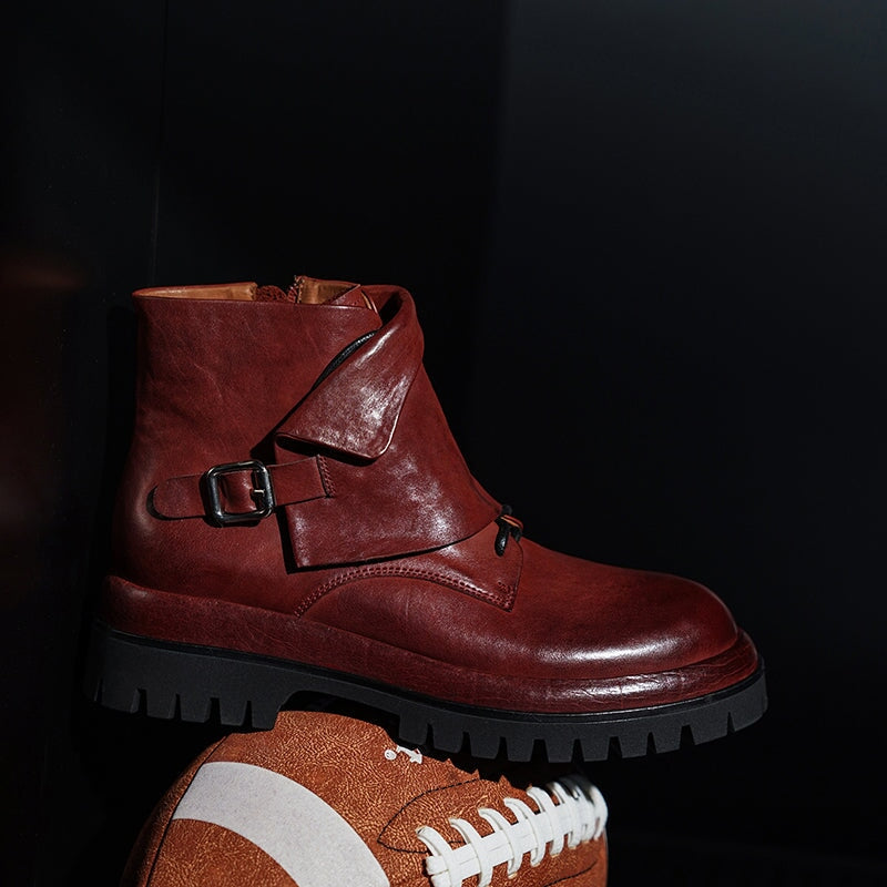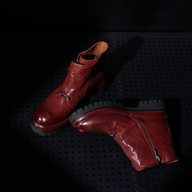 Designer Leather Platform Short Boots with Side Zip & Buckle in Wine Red/Black