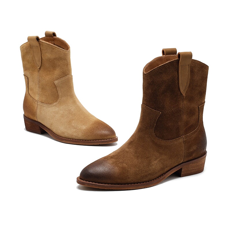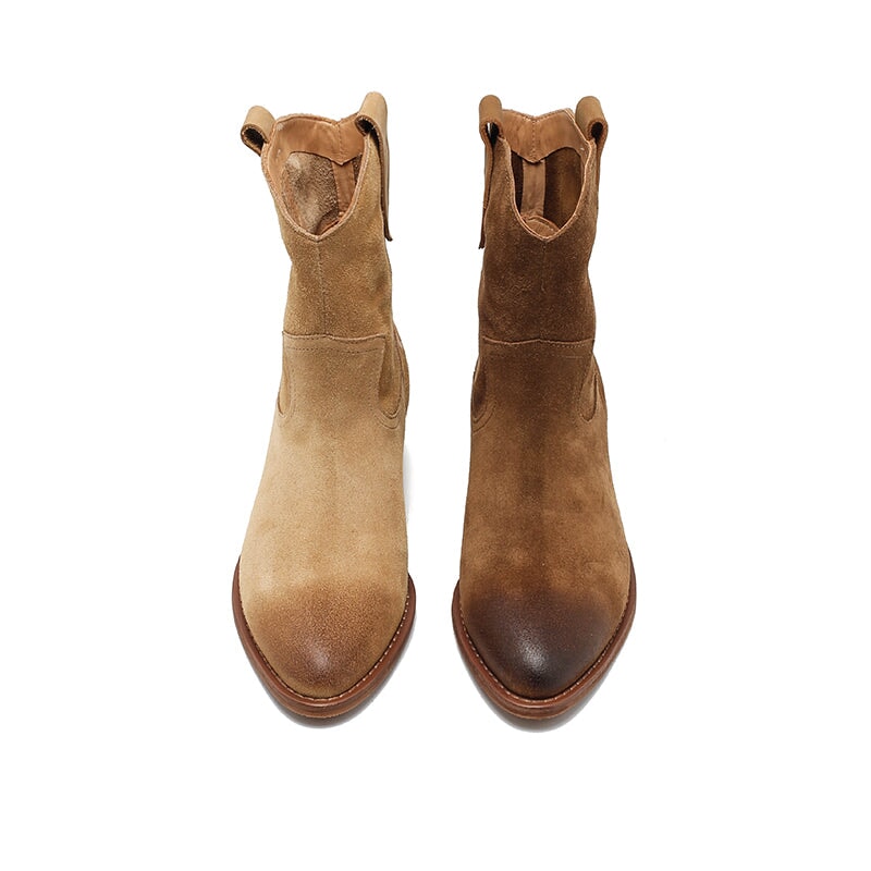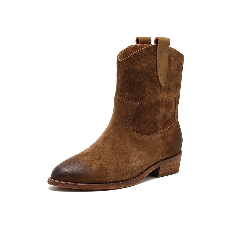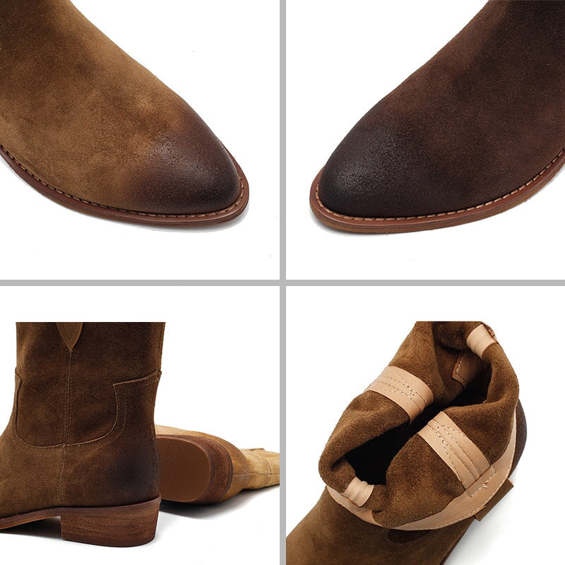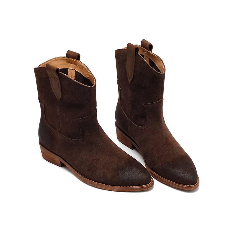 Dwarves Handmade Vintage Suede Leather Western Cowboy Boots for Women in Coffee/Brown/Dark Apricot