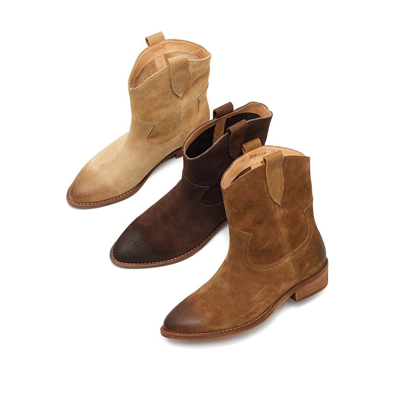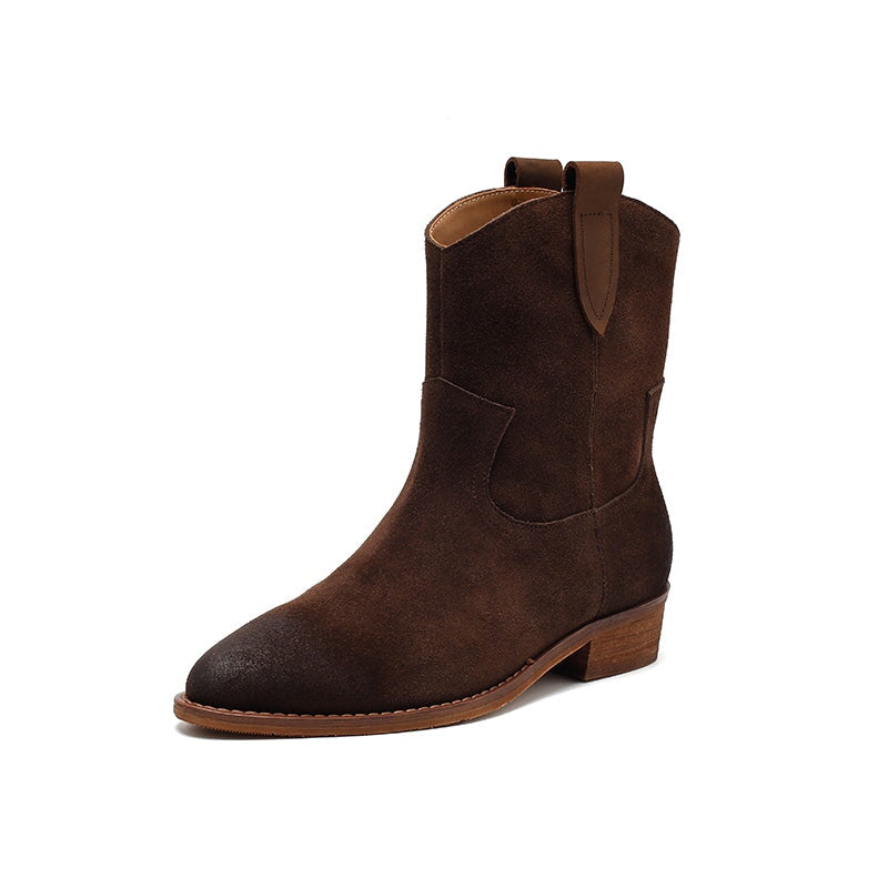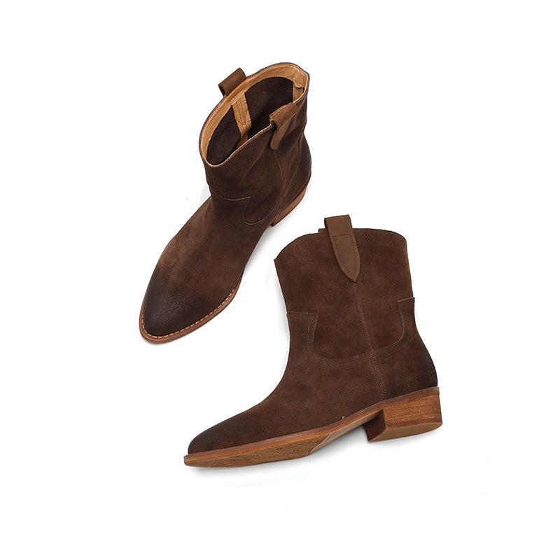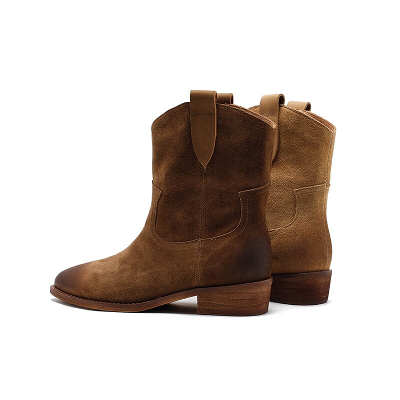 Expertly handcrafted from premium suede cowhide, these Dwarves Western Cowboy Boots feature a classic R-shaped toe and sturdy block heel for a timeless silhouette. The soft lining available in cow leather or short plush ensures comfort and warmth through every season. Built with a durable, high-elastic rubber sole that’s non-slip and wear-resistant, these short cowboy boots combine rugged Western charm with refined craftsmanship for everyday wear.