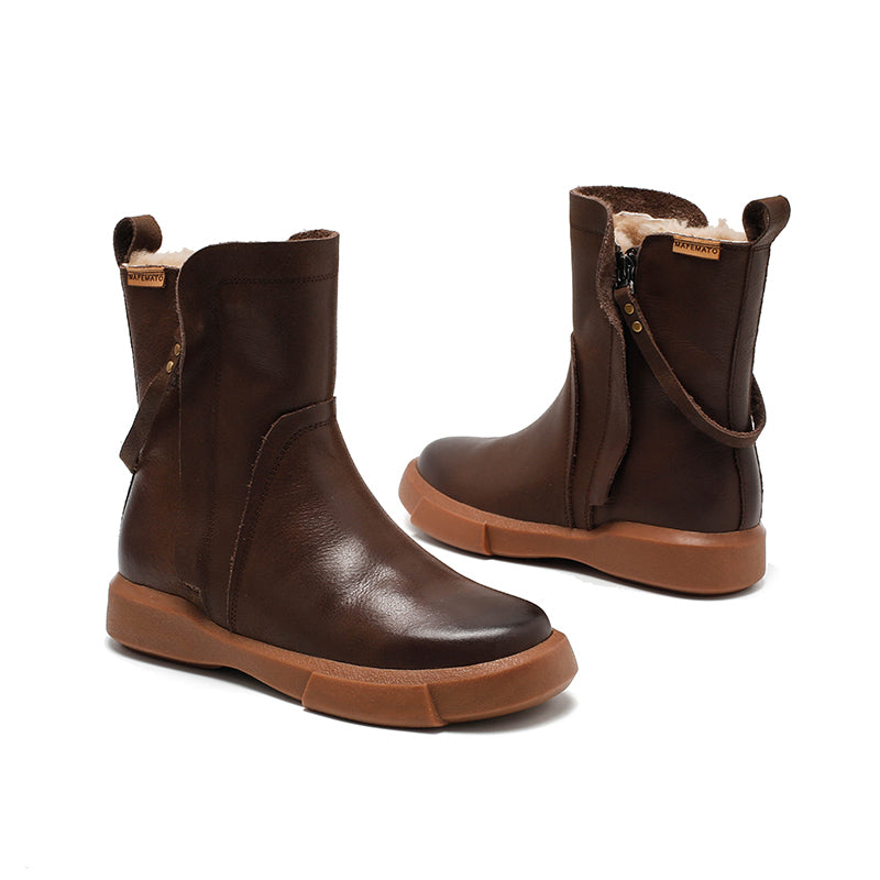 These handmade British-style Dwarves snow boots are crafted from top-layer oiled wax buffalo leather with a warm lamb fleece lining, perfect for winter. Featuring a round toe, double side zips, and short boot design, they combine retro charm with practical comfort. The high-elastic, soft, non-slip, and wear-resistant rubber sole ensures durability and stability for years. Each pair is carefully crafted by experienced shoemakers, making them ideal for cold weather and casual everyday wear.