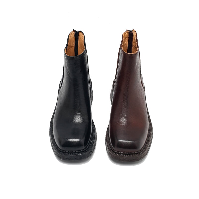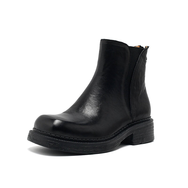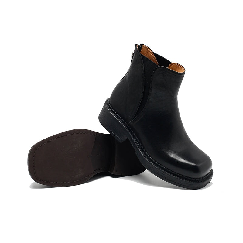 Handcrafted from full-grain vegetable tanned cowhide leather, these Dwarves Chelsea boots feature a classic round toe and a sturdy block heel for everyday comfort. Designed with a unique back zip for easy wear, they combine timeless vintage style with modern craftsmanship. Available with short plush lining for warmth or leather lining for breathability, making them perfect for year-round wear. The durable rubber sole ensures excellent traction and flexibility, making them perfect for casual or urban looks.