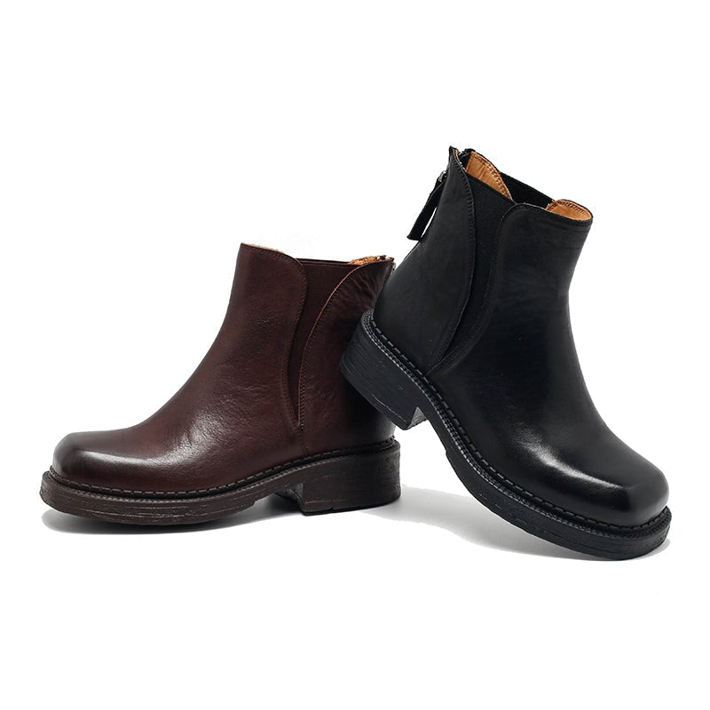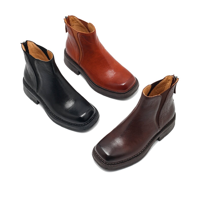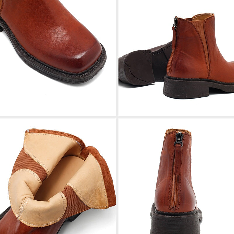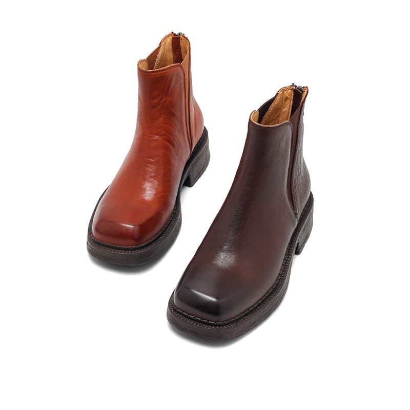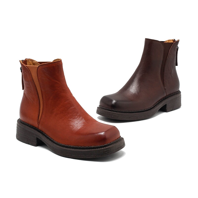 Dwarves Vintage Leather Chelsea Boots with Back Zip for Women in Red Brown/Black/Camel