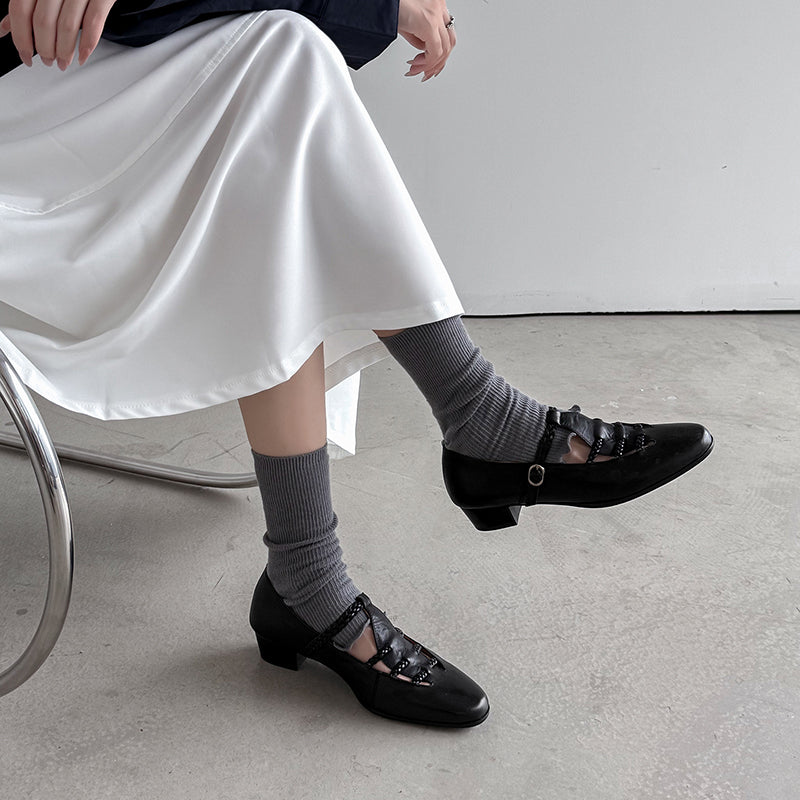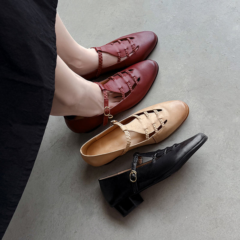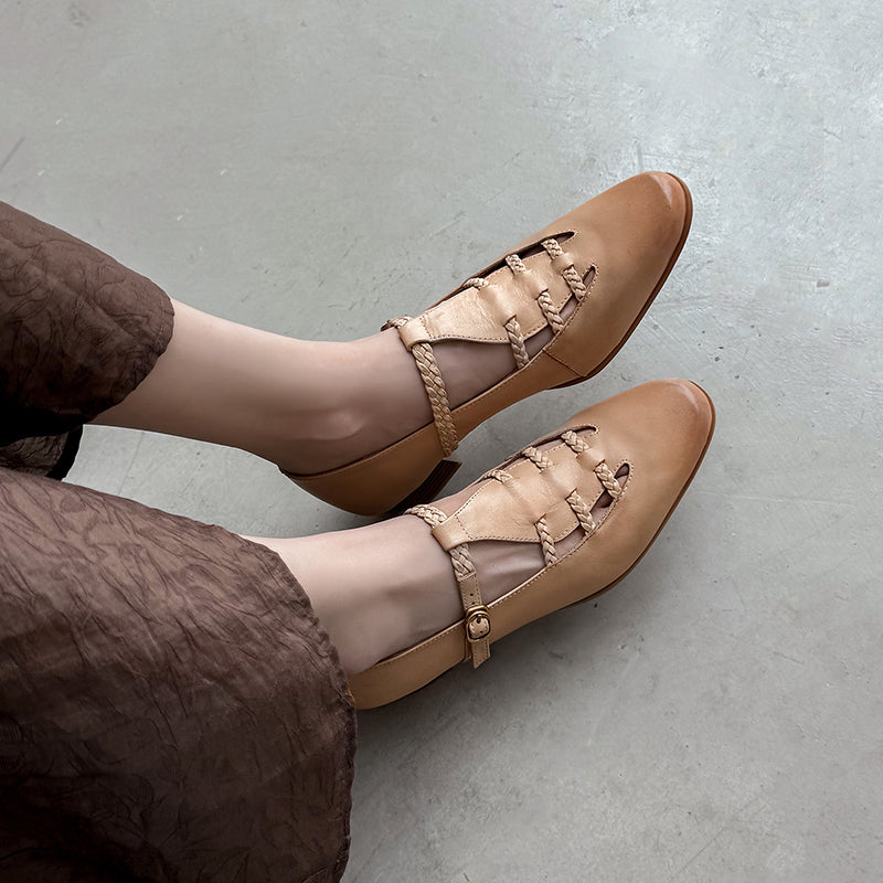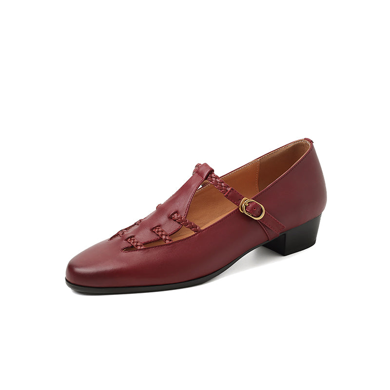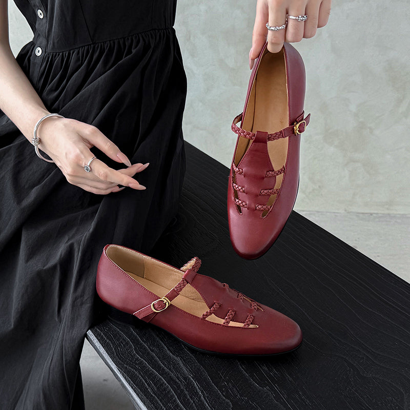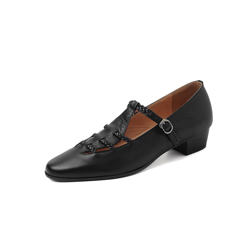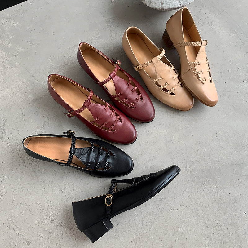 These elegant T-strap Mary Jane shoes blend vintage charm with everyday comfort. Crafted from premium top-layer cow leather, the shoes feature a unique woven hollow-out design that adds texture and breathability while enhancing their retro appeal. The round toe silhouette and adjustable T-strap provide a secure, flattering fit, making them easy to wear all day. Finished with a durable rubber outsole for steady traction, these casual yet refined leather Mary Janes pair effortlessly with dresses, skirts, or relaxed daily outfits for a timeless, feminine look.