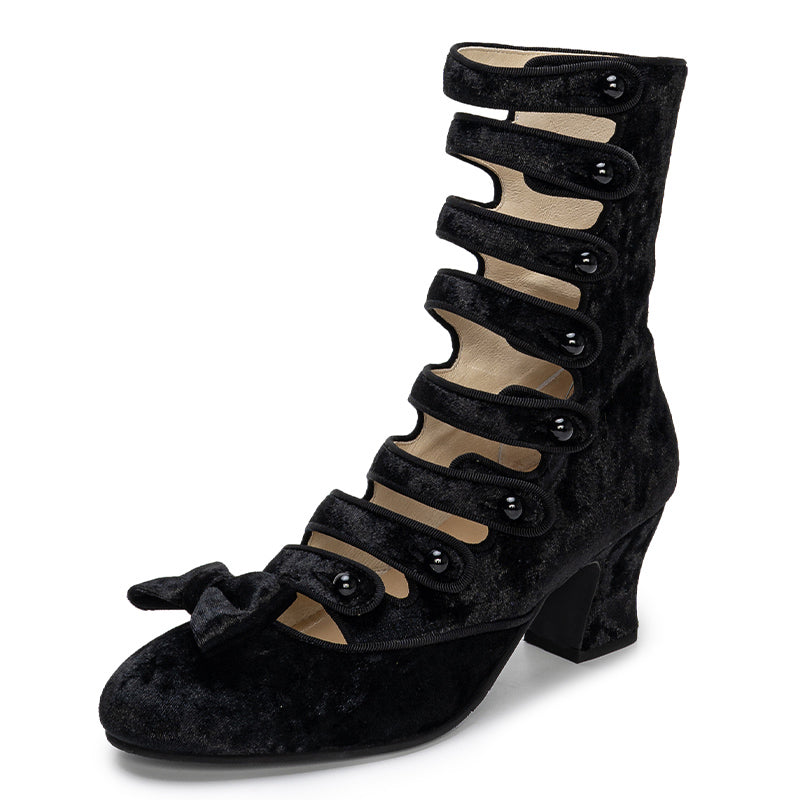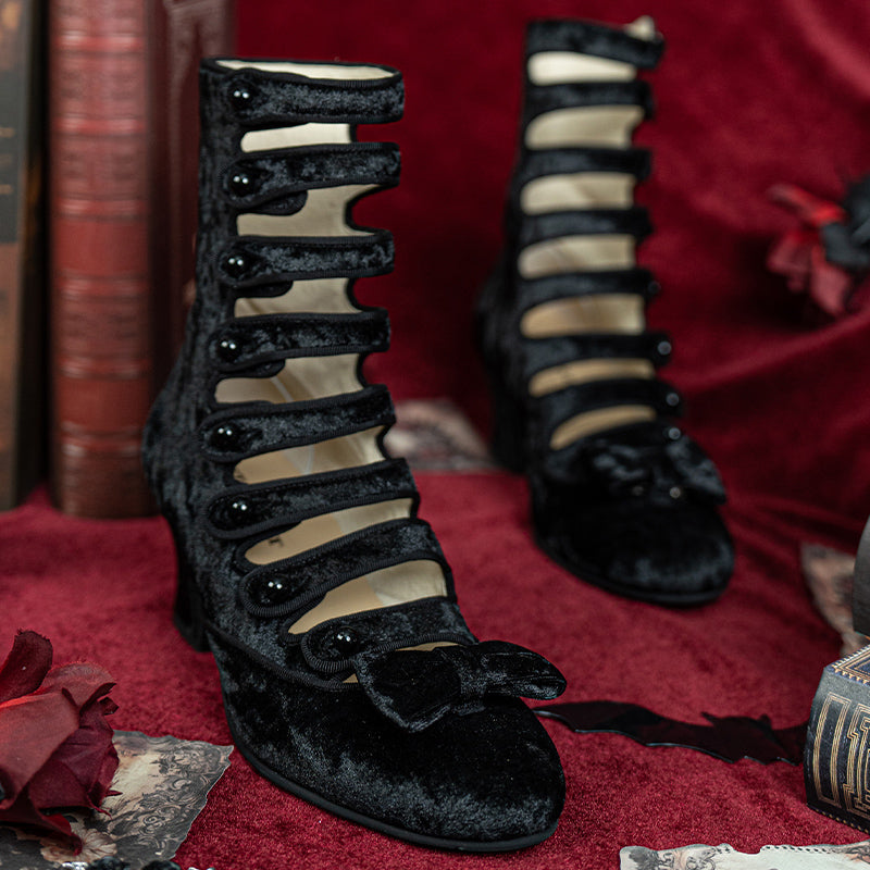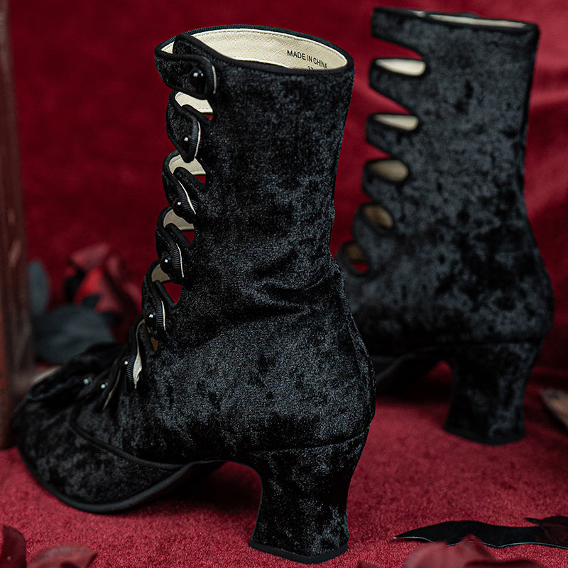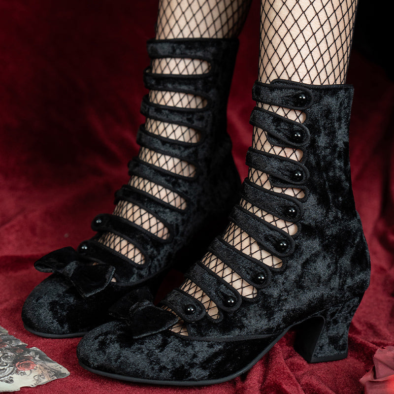 Handmade Gothic Lolita Velvet Button Boots for Women Vintage Bow Victorian Boots in Black