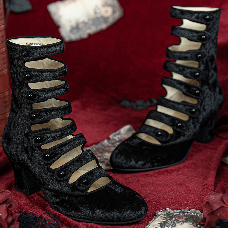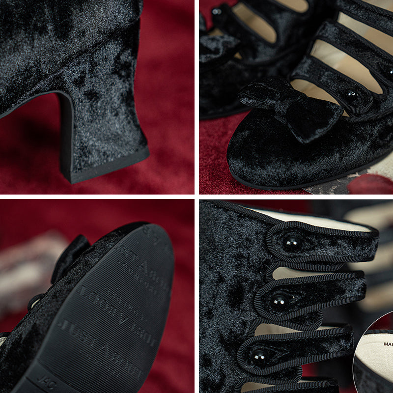 Step into timeless elegance with these handmade Gothic Lolita boots, crafted from soft black velvet with a round toe and charming front detachable bow detail. Featuring an 8-button strap design and a comfortable 60mm block heel, they perfectly blend Victorian romance with dark Gothic flair. The non-slip rubber sole ensures comfort and stability, making them ideal for Lolita fashion, vintage outfits, tea parties, or Gothic ensembles.