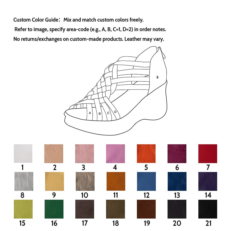 Custom Color Guide: Mix and match custom colors freely. Refer to image, specify area-code (e.g., A, B, C=1,D=2) in order notes. No returns/exchanges on custom-made products. Leather may vary.