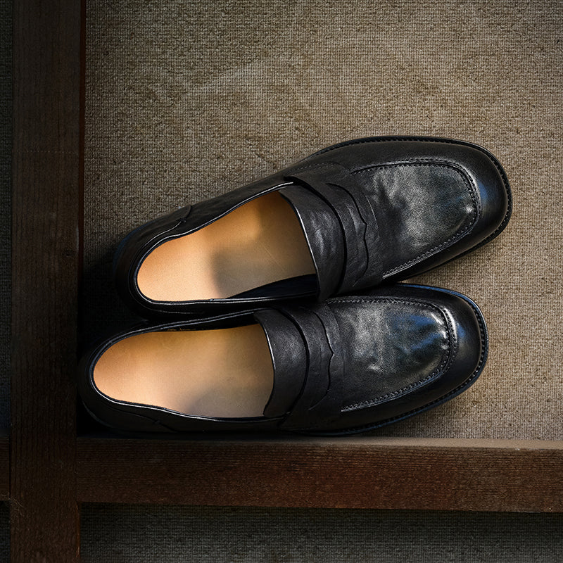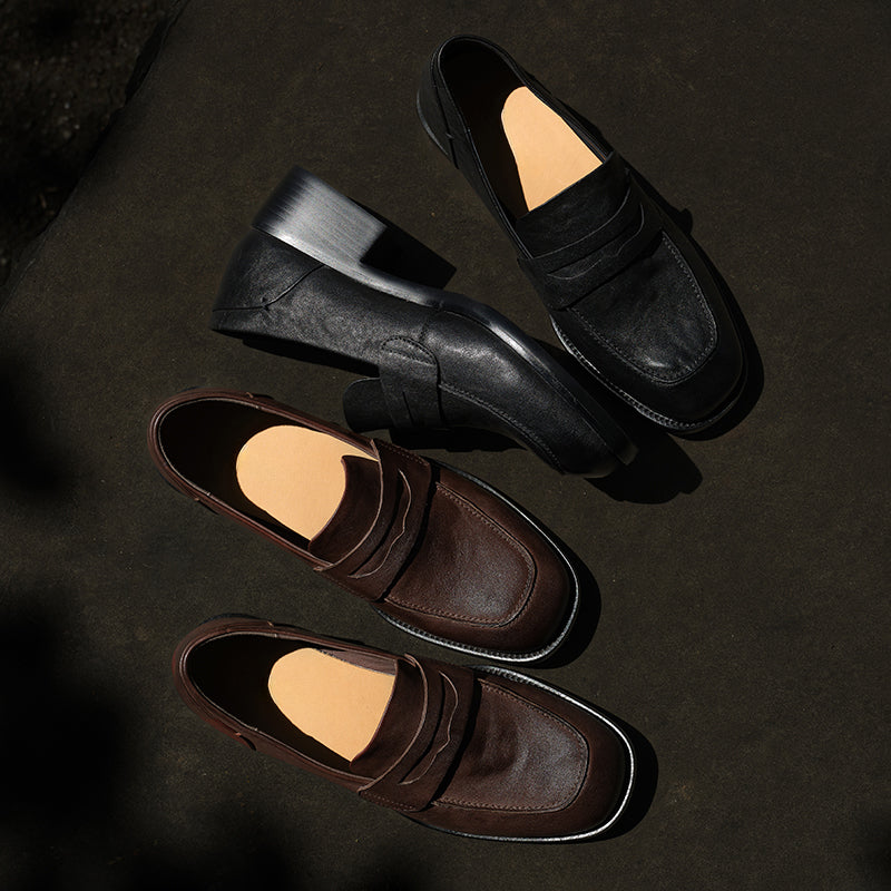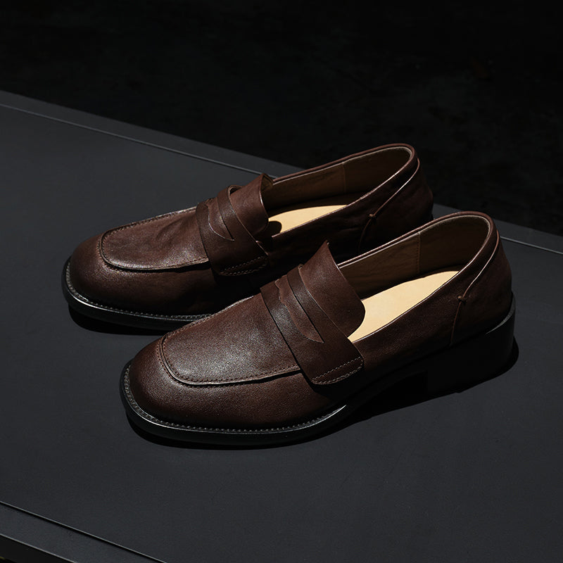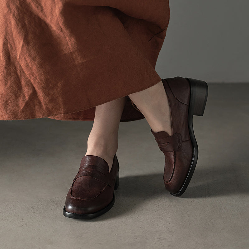 Handmade Retro Casual Square Toe Leather Penny Loafers for Women in Black/Brown