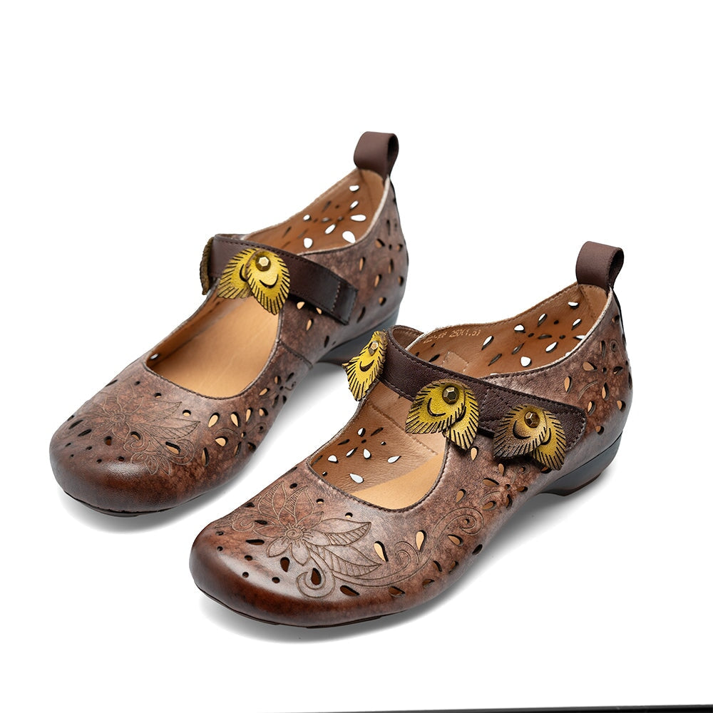 Handmade Retro Genuine Leather Mary Jane Shoes with Floral Cutouts in Grey/Coffee