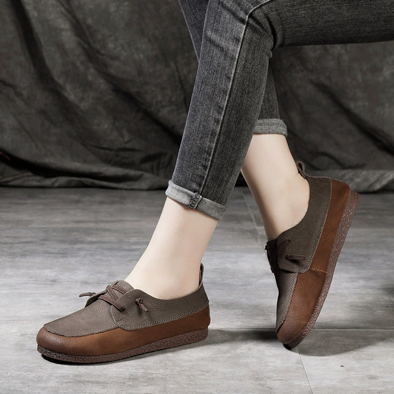 Handmade Two-Tone Cow Leather Oxford Shoes for Women Lace-Up Flat Casual Shoes in Grey/Coffee