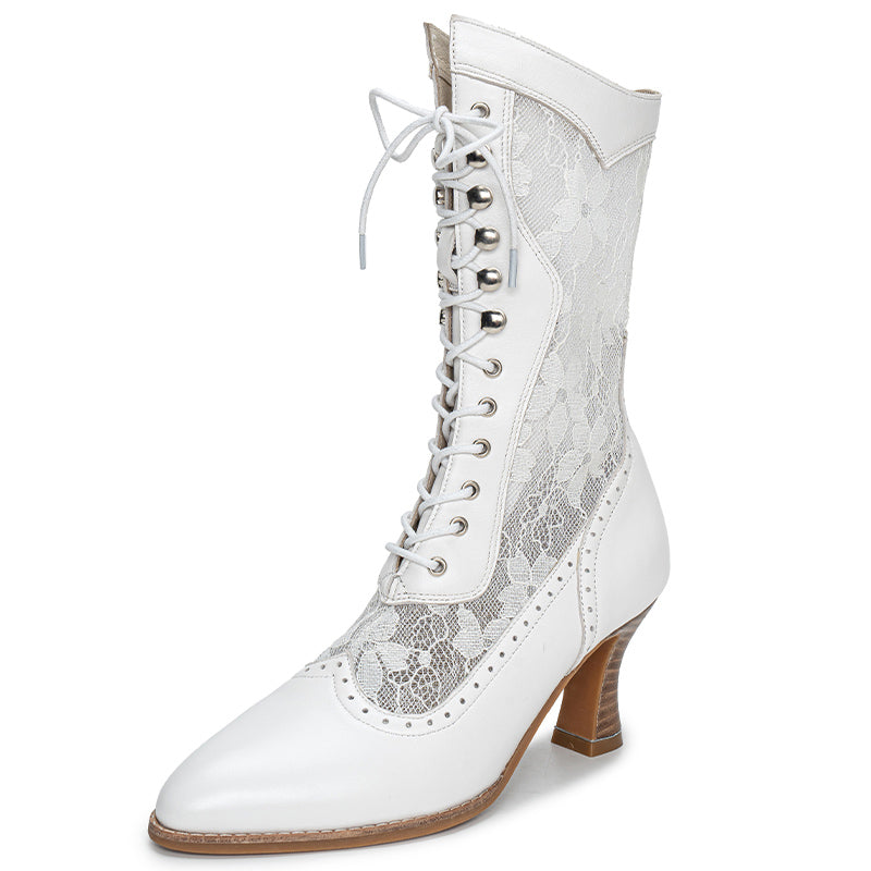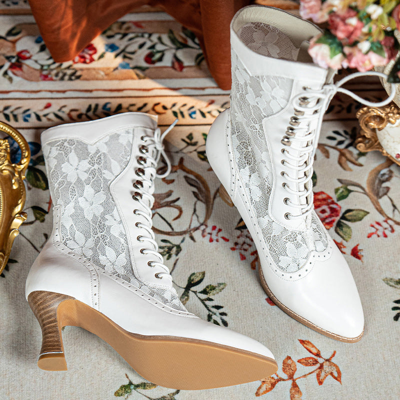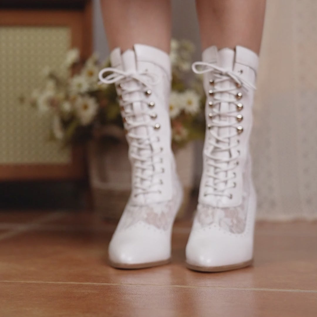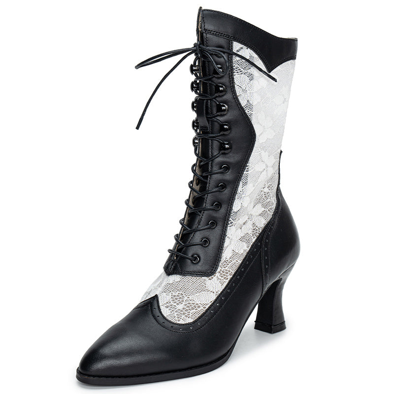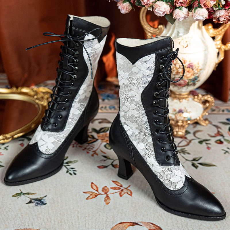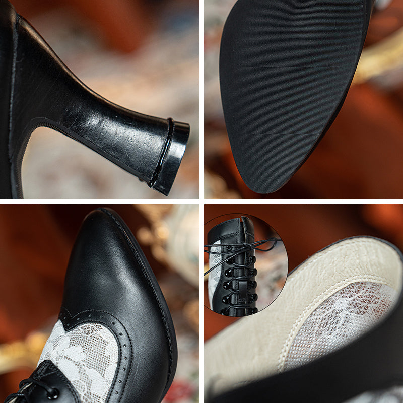 Step into dark romance with these Gothic Victorian lace-up brogue boots, inspired by Edwardian and Lolita aesthetics. Crafted from soft cowhide leather and delicate lace fabric, featuring a 70mm real leather-wrapped spool heel, these boots blend vintage elegance with witchy gothic charm. The rubber sole is highly elastic, soft, non-slip, and wear-resistant, ensuring comfort and durability. Each pair is handmade by experienced craftsmen, designed to be worn and treasured for years. Perfect for reenactments, vintage parties, theater, Gothic or Lolita outfits, and everyday retro wear.