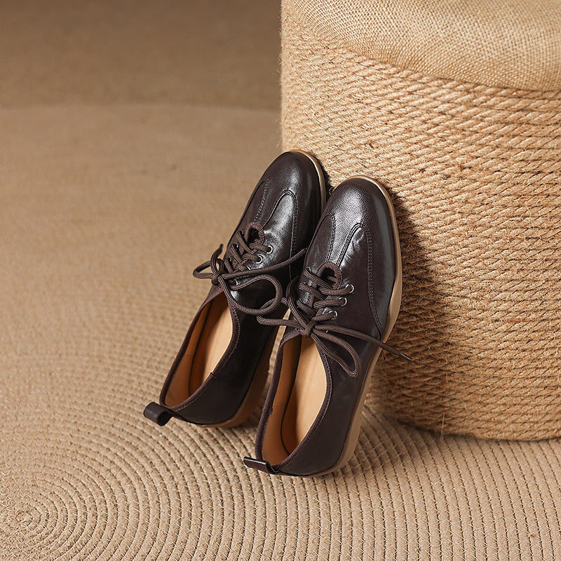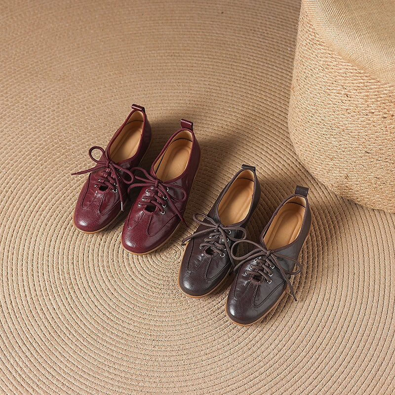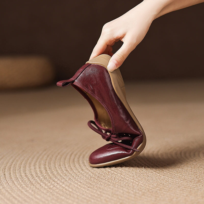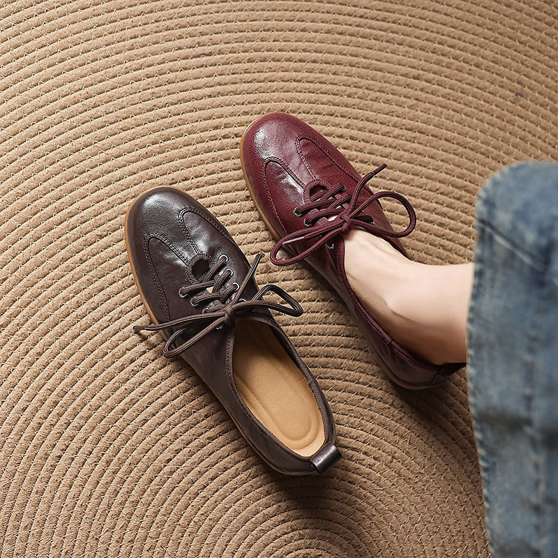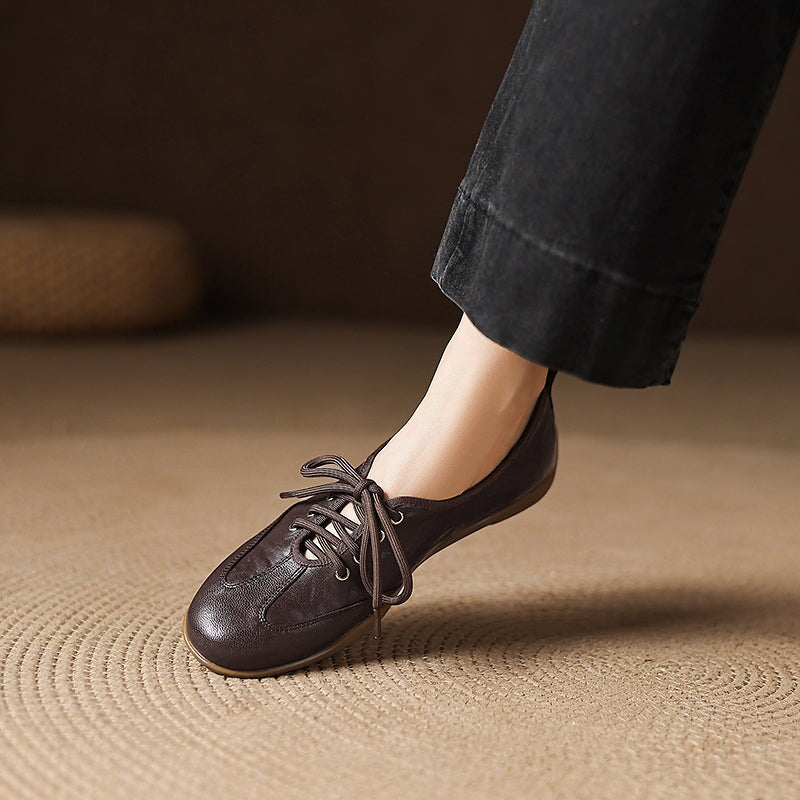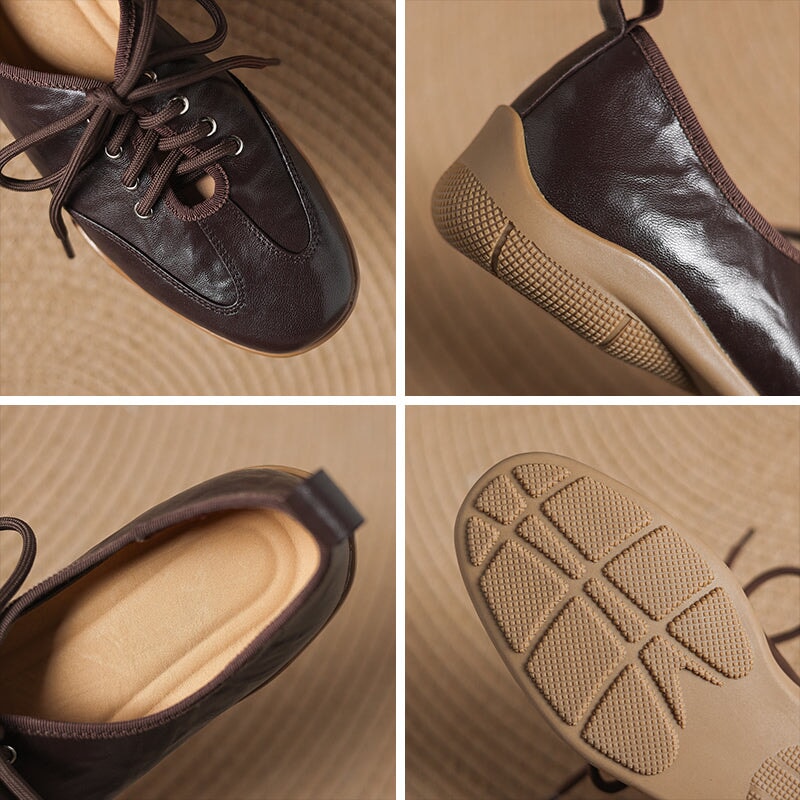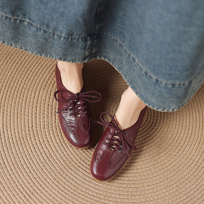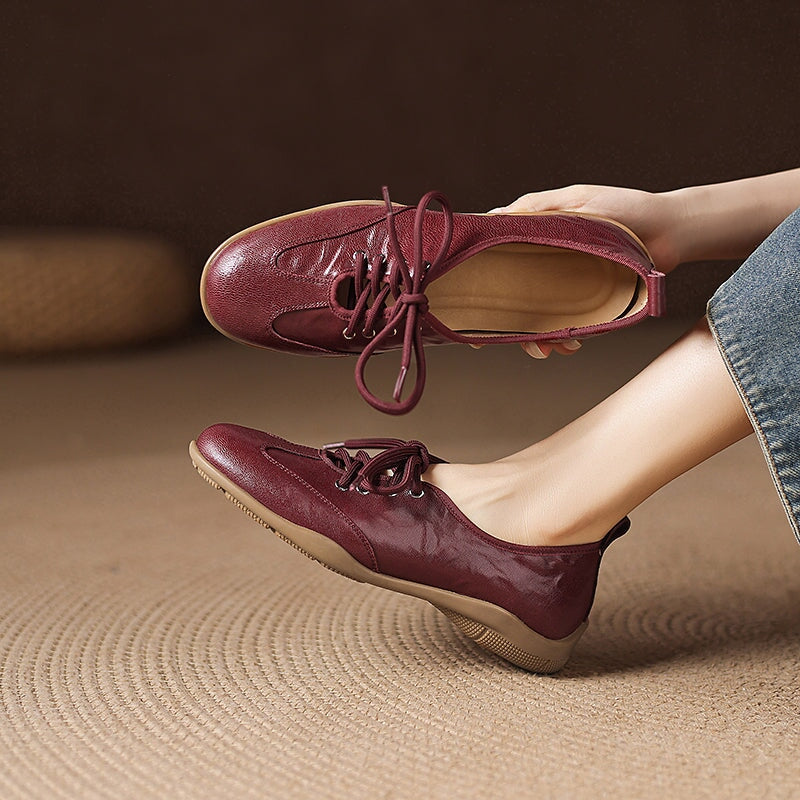 Designed for a natural, barefoot-inspired feel, these vintage lace-up flats are handcrafted from hand-textured sheepskin leather that’s exceptionally soft and flexible. The round toe shape allows your feet to move comfortably, while the flat rubber sole provides light grip and everyday durability without sacrificing that close-to-the-ground sensation. Each pair is carefully handmade by skilled craftsmen, highlighting subtle textures and a timeless retro aesthetic.