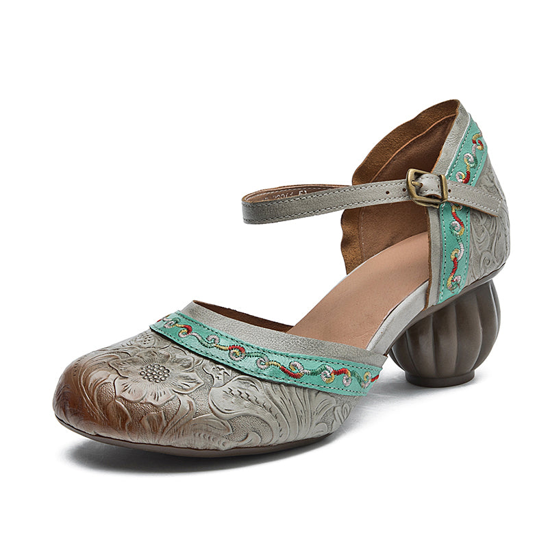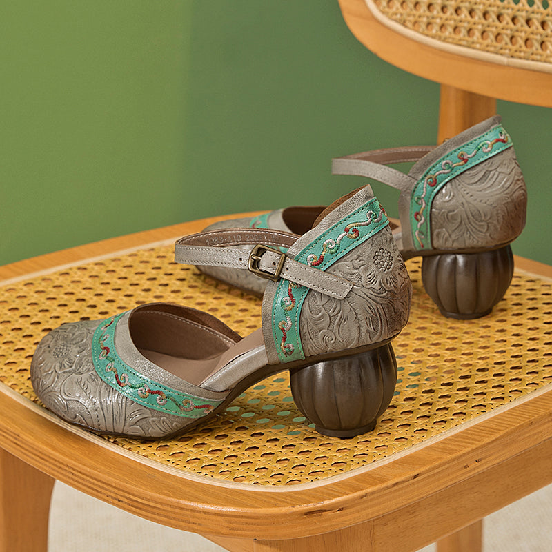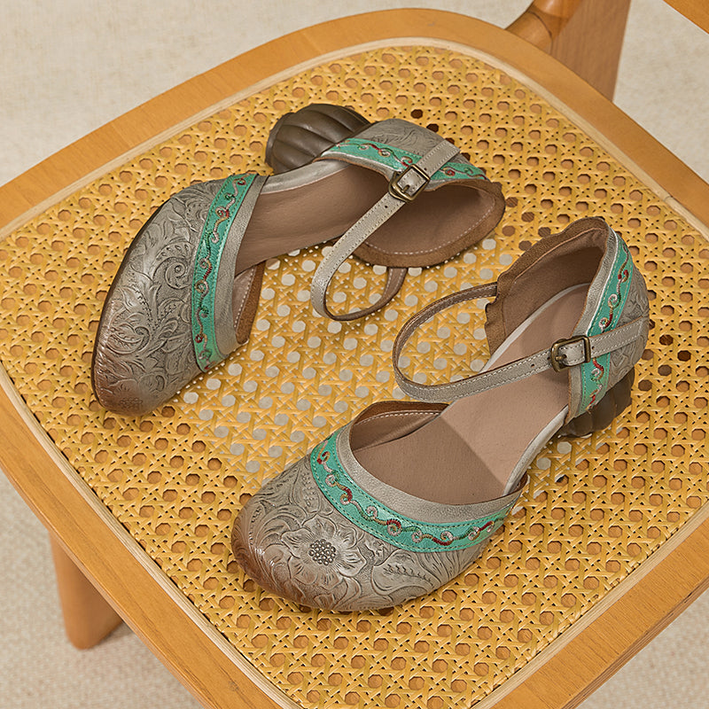 Inspired by traditional Chinese craftsmanship, these handmade Mary Jane pumps feature exquisite embossed floral patterns and delicate embroidery. Made from premium full-grain cow leather, they offer a soft, durable fit with a classic round toe and a 50mm sculpted cylinder heel. The adjustable ankle strap ensures comfort and stability, while the non-slip rubber sole adds practicality. A perfect blend of vintage artistry and modern elegance for everyday wear or special occasions.