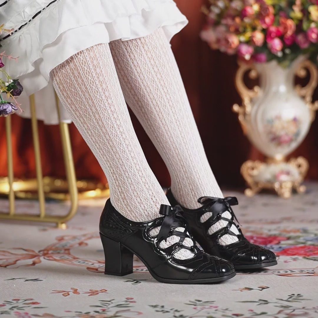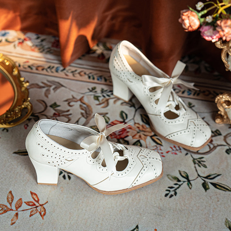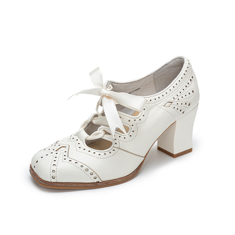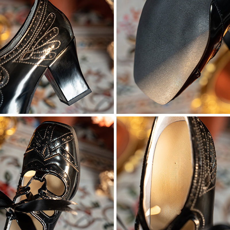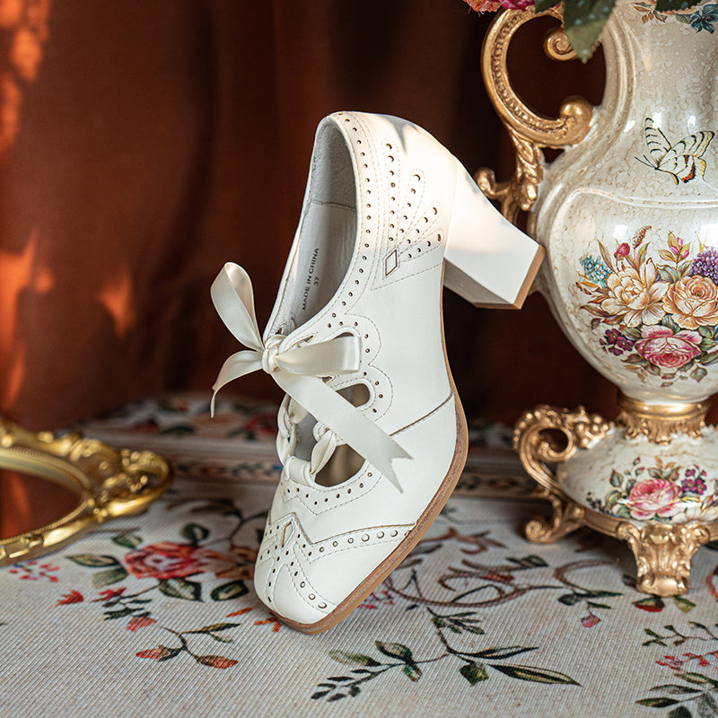 Step into timeless elegance with these handmade vintage Mary Jane pumps, blending British retro charm and modern comfort. Featuring a square toe, delicate lace-up ribbon, and refined brogue detailing, these shoes exude understated sophistication. Crafted from matte soft cowhide leather with a durable rubber sole and a stable 70mm block heel, they offer both beauty and all-day wearability. Perfect for pairing with retro, cottagecore, or classic British-style outfits, these pumps bring graceful femininity to any occasion.
