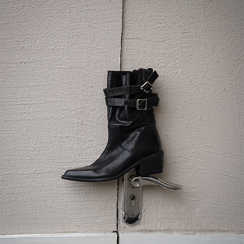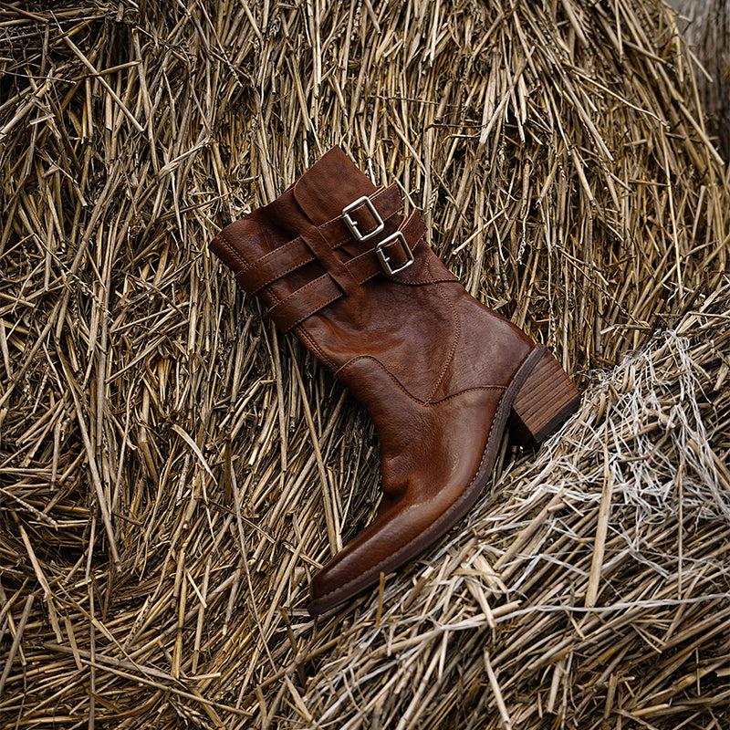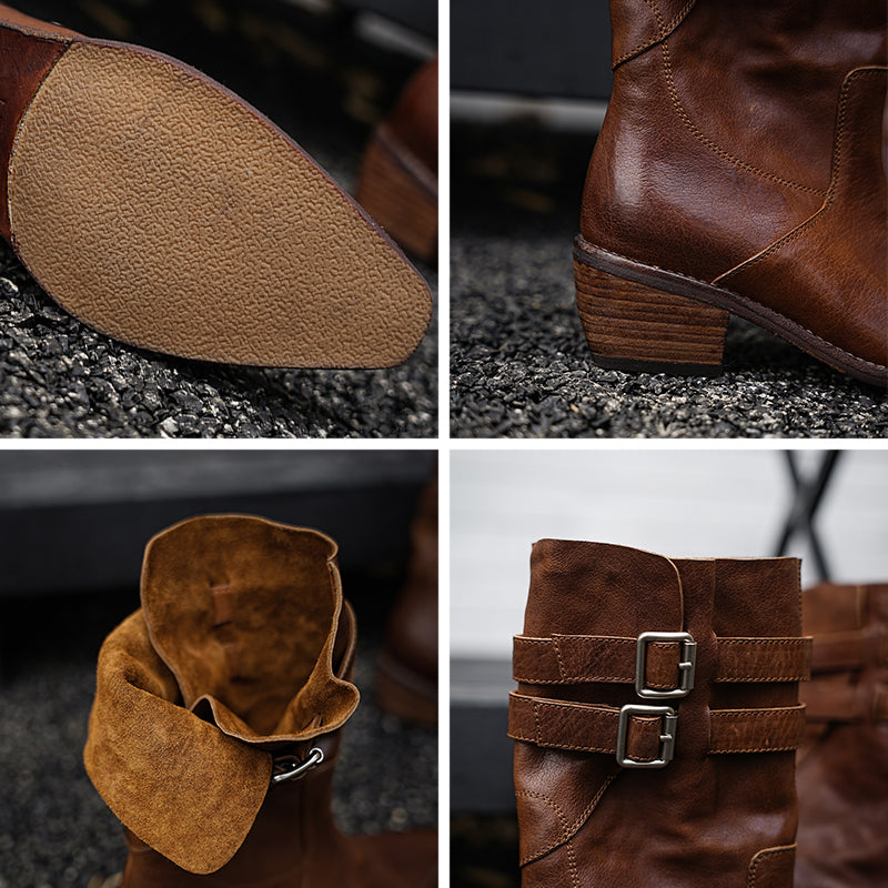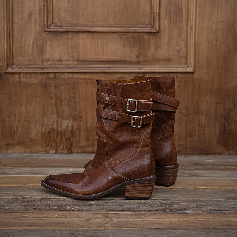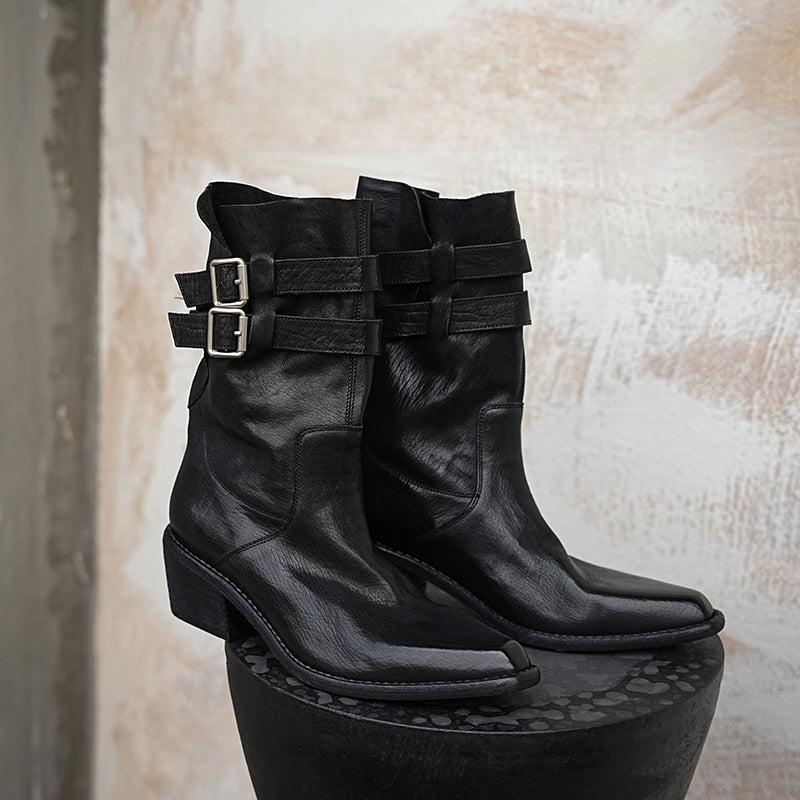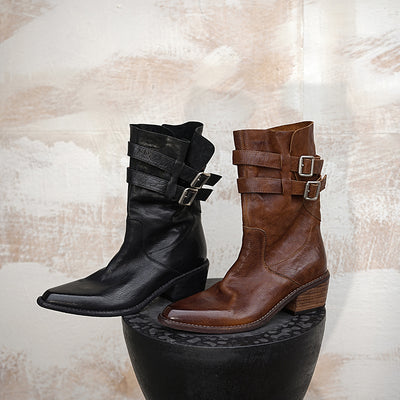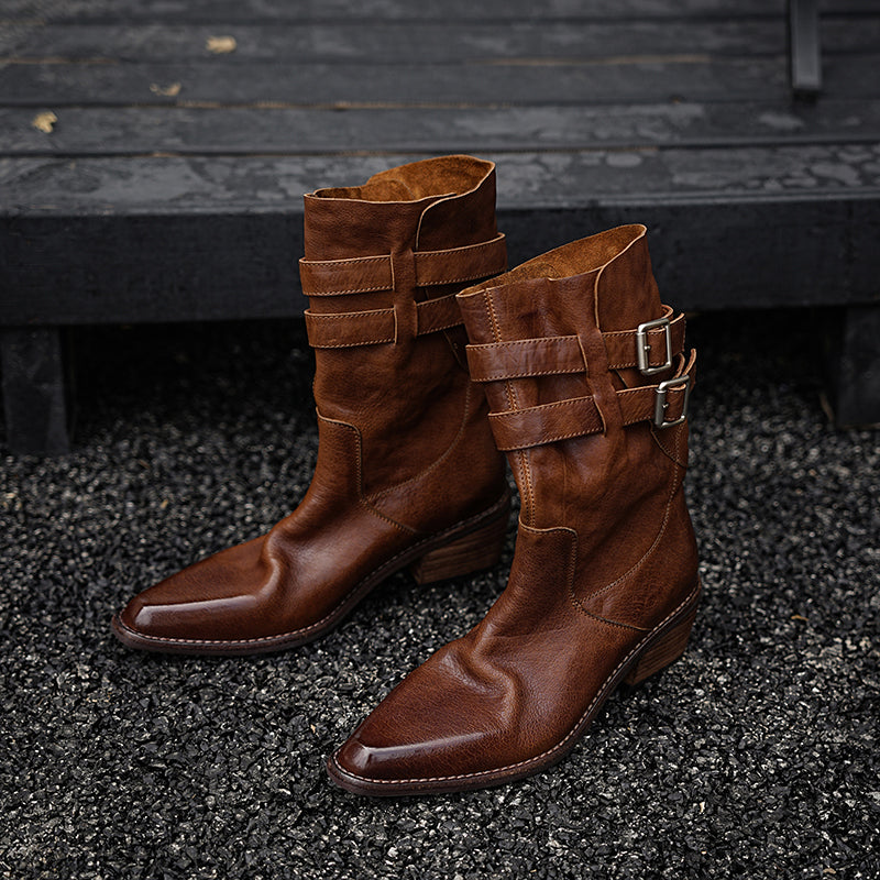 Channel rugged western charm with these handmade vintage R-toe mid calf boots. Crafted from premium washed calfskin leather, they feature a worn-in retro finish and sturdy double buckle straps for a bold, biker-inspired look. The short Western-style silhouette sits on a comfortable block heel with a durable leather sole that’s non-slip, wear-resistant, and perfect for all-day walking. Each pair is meticulously crafted by skilled artisans, ensuring long-lasting quality and unique character.