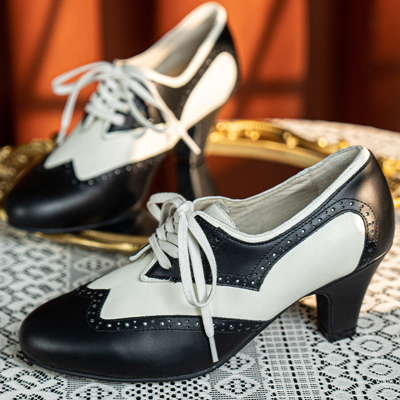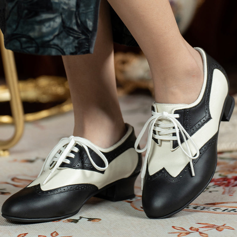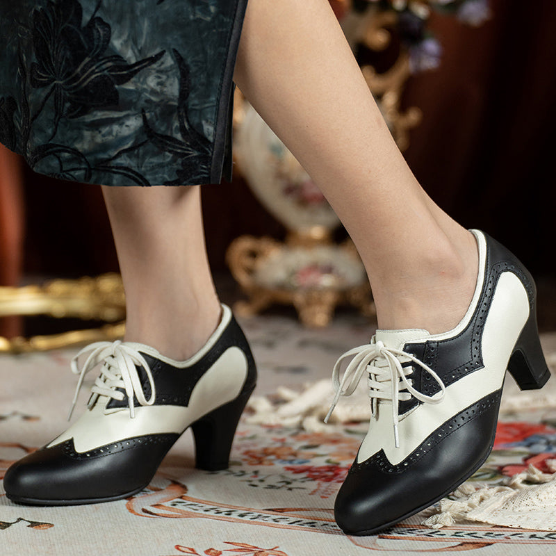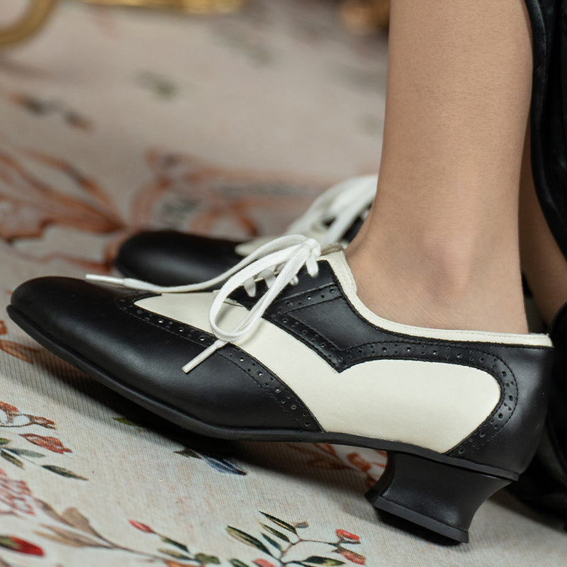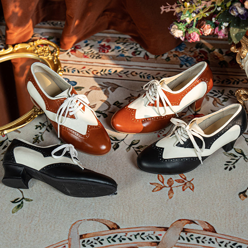 Handmade Vintage Leather Wingtip Oxford Shoes for Women Two-Tone Lace-Up Brogue Pumps in Black/Brown