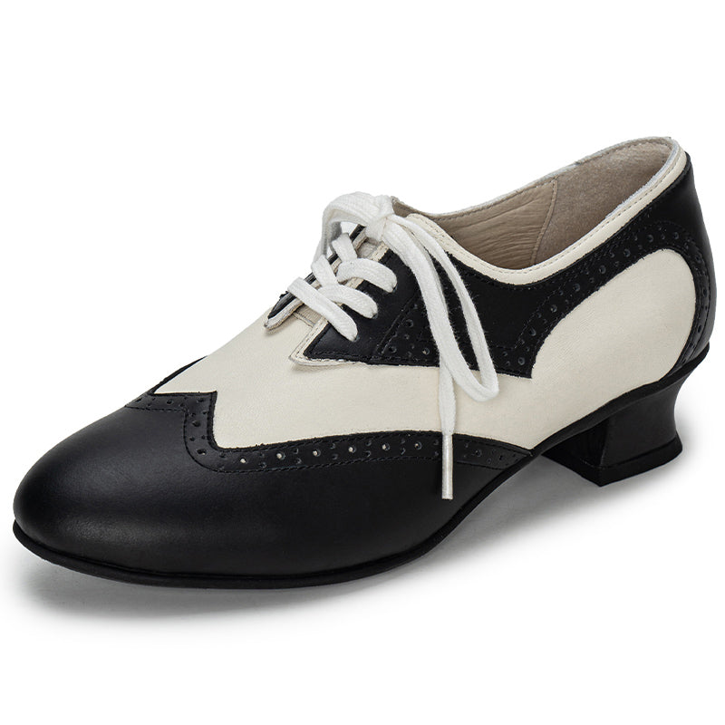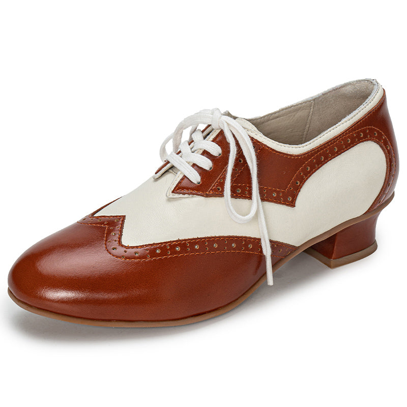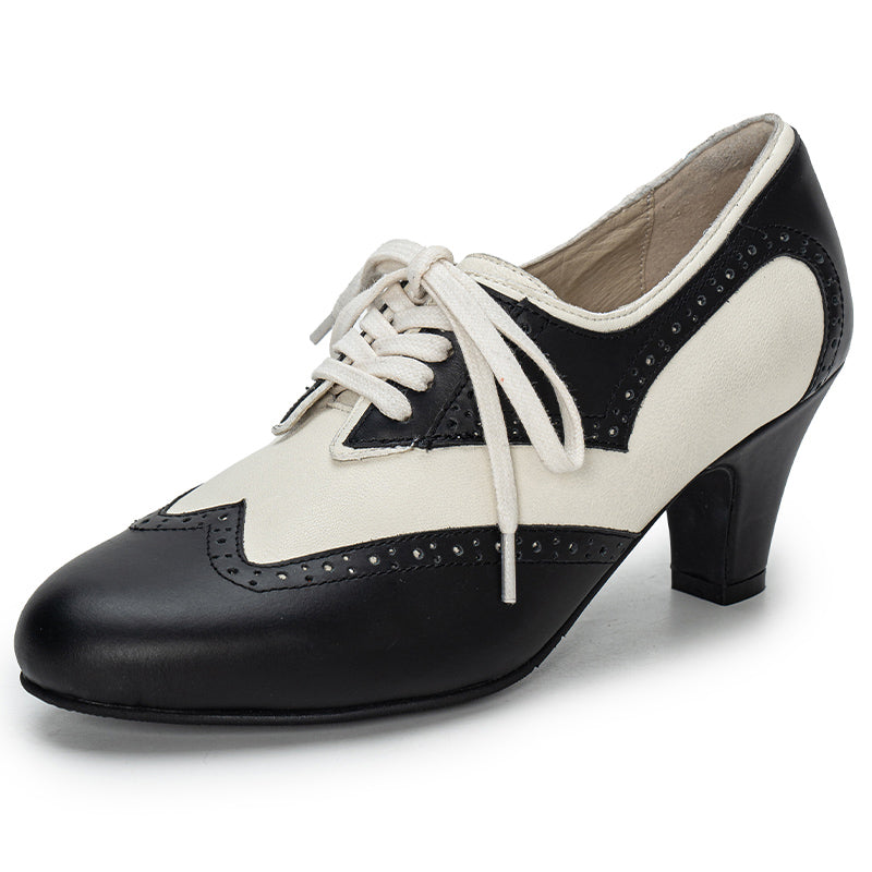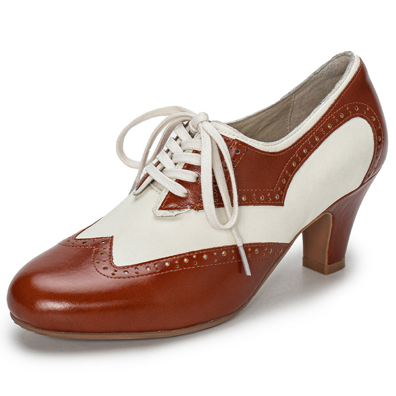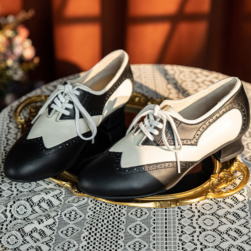 Handmade Vintage Leather Wingtip Oxford Shoes for Women Two-Tone Lace-Up Brogue Pumps in Black/Brown