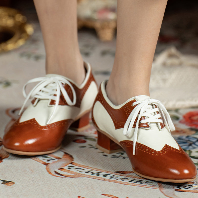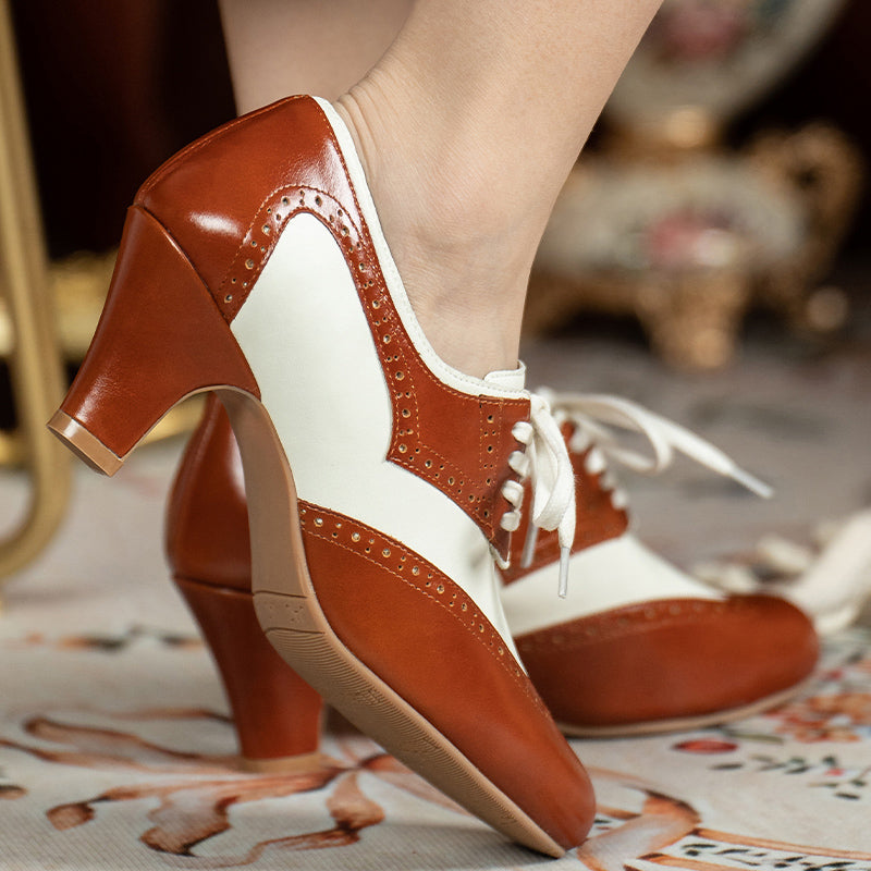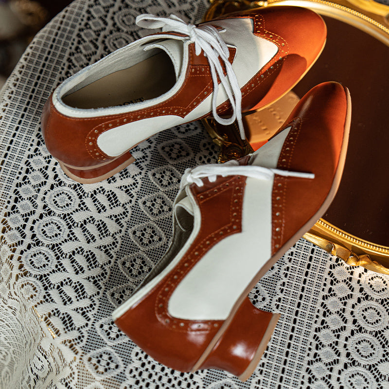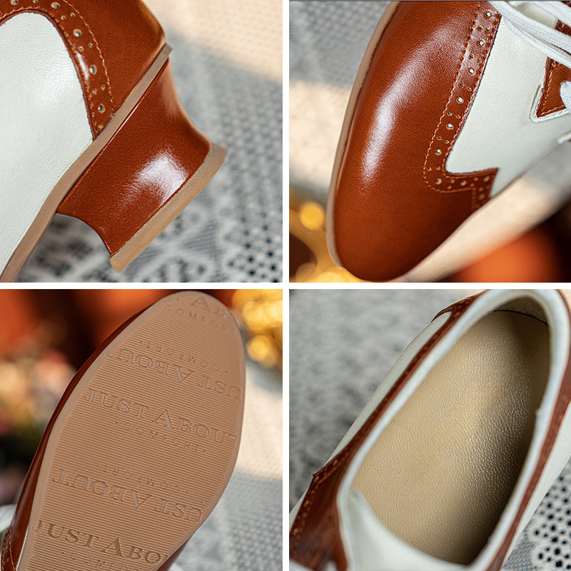 Channel timeless sophistication with these vintage-inspired handmade Oxford shoes, crafted from a mix of oil-waxed soft cow leather and Nappa leather. Featuring a classic round toe, elegant wingtip brogue detailing, and a comfortable block heel, these shoes perfectly blend British retro charm with modern craftsmanship. The two-tone color design adds a refined contrast, while the rubber sole ensures lasting comfort and durability. Ideal for pairing with vintage dresses, tailored trousers, or office wear, these Oxfords bring effortless elegance and personality to any outfit.