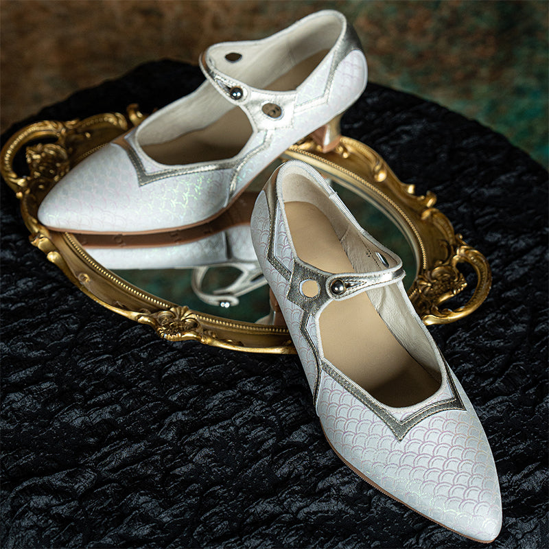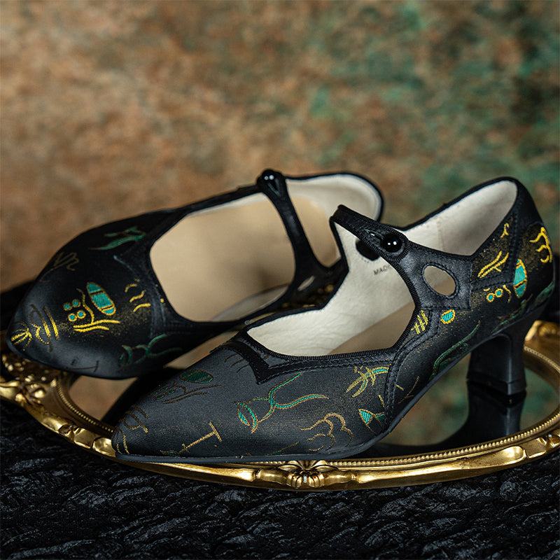 Step into refined elegance with these Handmade Vintage Mary Jane Pumps, blending soft cow leather with premium jacquard fabric inspired by Chinese traditional aesthetics.