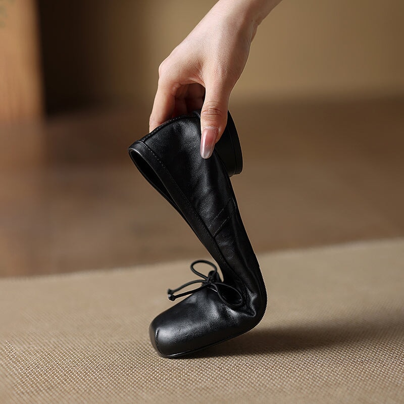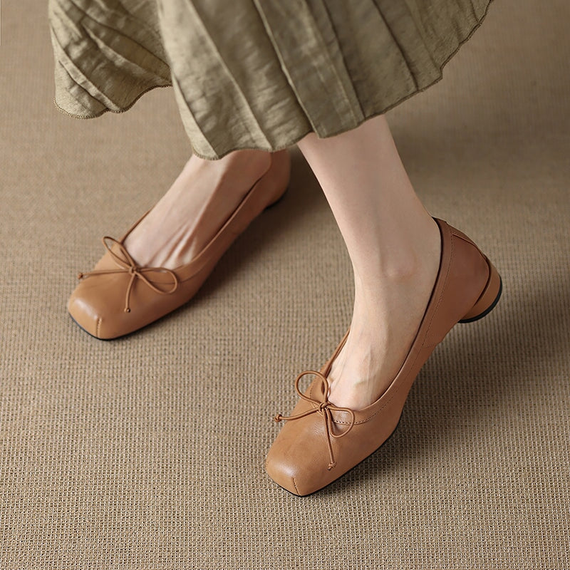 These handmade women’s ballet flats feature a chic square toe and a delicate bow-tie detail for a timeless, elegant look. Crafted from top layer water-washed cow leather, they feel soft, supple, and naturally textured. The 25mm low cylinder heel adds subtle lift while keeping them comfortable for everyday wear. Designed as easy slip-on flats, they include a top layer genuine leather lining and top layer cow leather insole for breathable, all-day comfort.